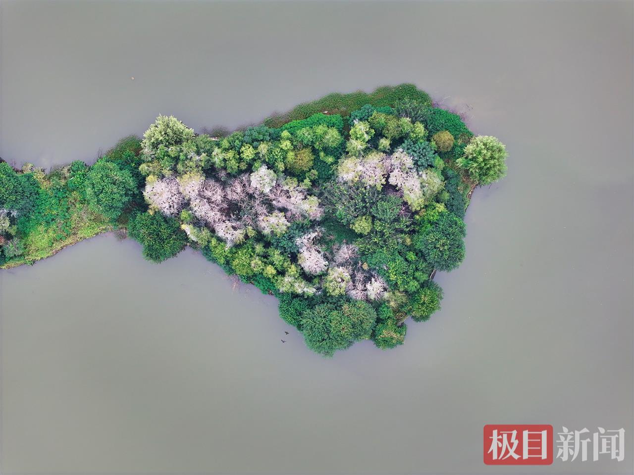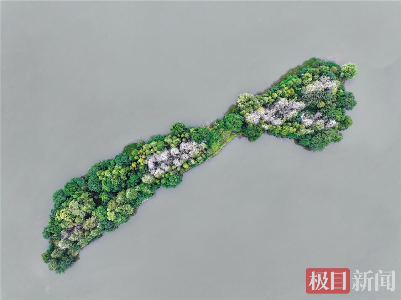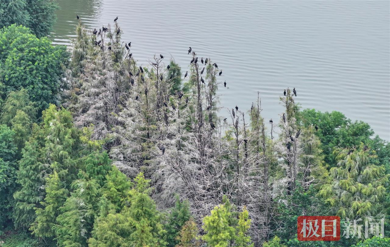 又到了一年候鸟迁徙季。近日,武汉东湖落雁景区的“走人棋鸟岛”上迎来一批鸬鹚,它们将在这里停留越冬,捕鱼为食。10月17日,记者在现场看到,湖心小岛的树梢上停满了通体乌黑的鸬鹚。从高空俯瞰,湖心岛中心区域仿佛覆盖了一层白雪,与周边绿油油的枝叶形成强烈反差。实际上,这是鸬鹚的排泄物把树木染成了白色。