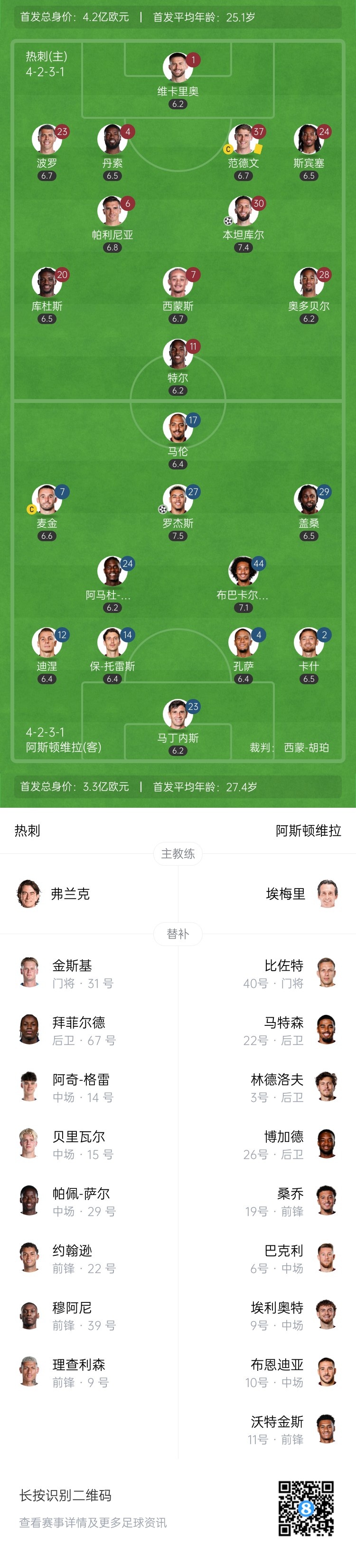 半场-热刺1-1维拉 本坦库尔破门库杜斯进球被吹 罗杰斯世界波扳平
