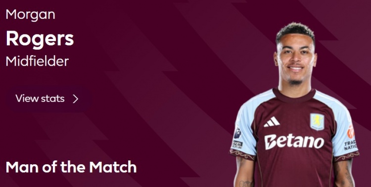 本场比赛上半场维拉球员罗杰斯打进远射世界波,赛后他也当选英超官方球迷票选全场最佳球员。