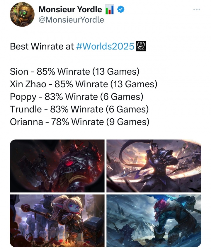 直播吧10月20日讯今日瑞士轮第三轮所有比赛已经结束了,赛后有外媒公布了目前S15世界赛中胜率最高的前五名英雄(出场次数达到五次或以上):