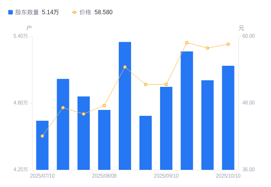 日期A股户数(户)流通A股户均持股数(股)户均持股市值(万元)2025-10-10513528700.3150.972025-09-30500568925.5751.682025-09-19526428487.1149.952025-09-10494579033.6846.392025-08-29468509536.3648.972025-08-20534938352.0945.502025-08-08473879428.2944.842025-07-31485999193.1642.332025-07-18501738904.7642.012025-07-10464149625.9440.51