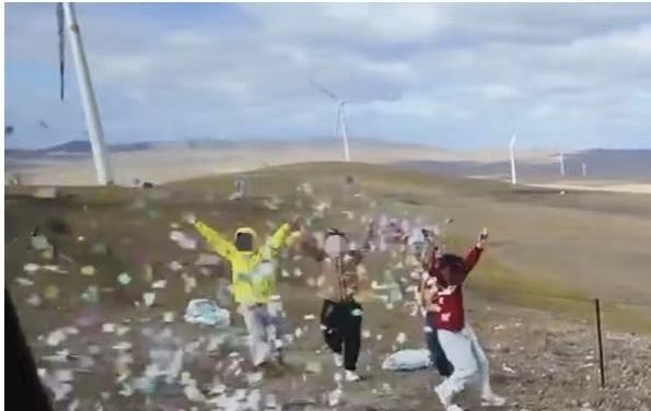 几名男女游客在内蒙古呼伦贝尔大草原站成排“放肆挥撒”纸片,前面有人用手机拍摄视频,身后地上还堆了一些袋装物,现场满地的纸片被风刮得七零八落,现场有风力发电装置。 发视频的还说撒的是可降解糯米纸,就算是真的糯米纸,降解也要两三个月吧?草原上的牛羊误食了怎么办?这跟扔普通垃圾有啥本质区别?说白了就是为了拍网红视频,把公共草原当自家摄影棚了。 不过也有人说,有些地方撒“龙达”也是糯米纸做的,算祈福习俗。可那是传统习俗,跟这种为拍视频“放肆撒欢”能一样吗?你们觉得,这事到底该严惩还是教育一下就行?