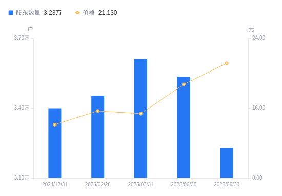 日期A股户数(户)流通A股户均持股数(股)户均持股市值(万元)2025-09-30322896731.7414.222025-06-30353416150.4011.502025-03-31361056020.259.242025-02-28345326294.499.862024-12-31339906394.869.022024-09-30350406203.238.652024-06-30365905940.457.062024-03-31348106244.227.242023-12-31378074343.447.102023-09-30300895457.558.20