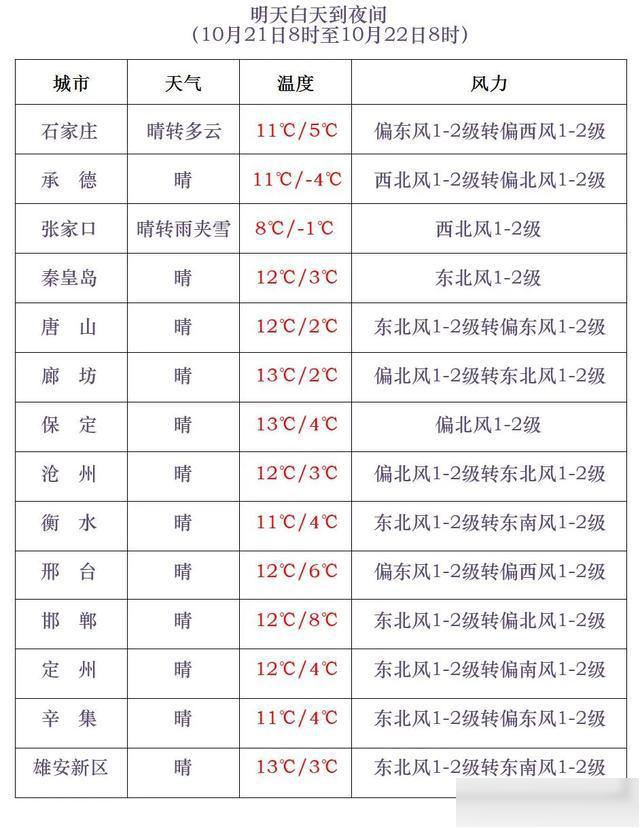 受槽后西北气流影响今日河北以晴或多云天气为主预计21日夜间到22日夜间受冷空气影响北部地区将迎来一轮降水过程主要以雨夹雪或小雪为主局地有中雪到大雪