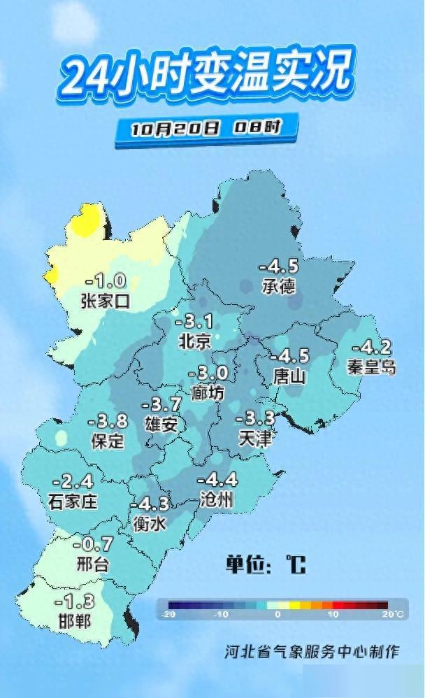 和昨天同时刻相比,今日8时河北省大部地区气温继续下降,承德、唐山、秦皇岛、廊坊、保定、沧州、衡水一带降温幅度多达4~6℃。