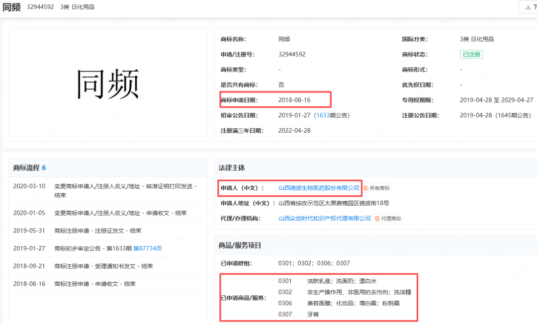 值得一提的是,企查查数据显示,锦波生物早在2018年便开始“同频”3类日化用品商标注册申请。