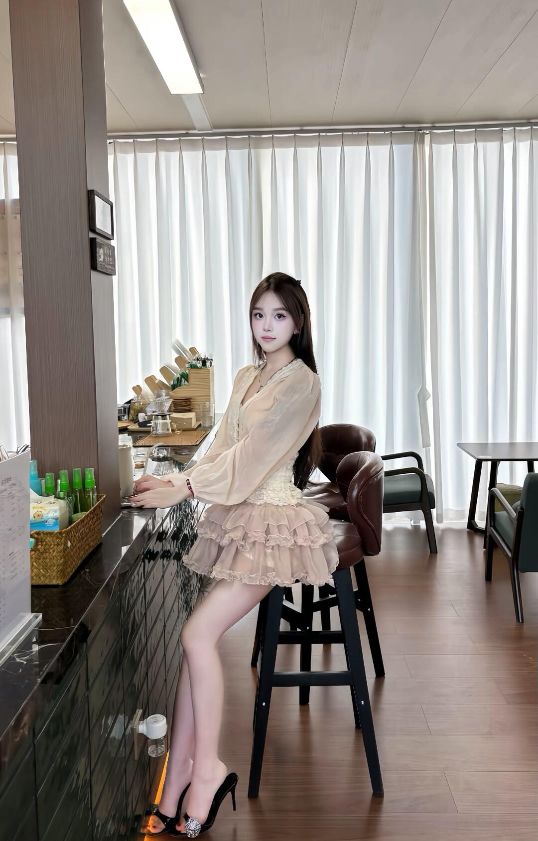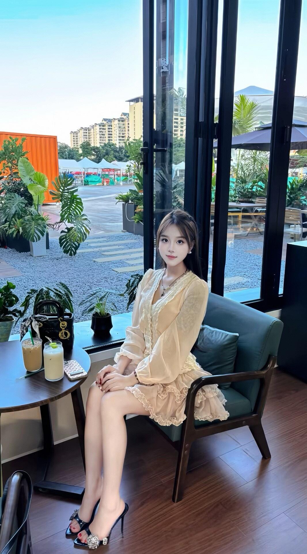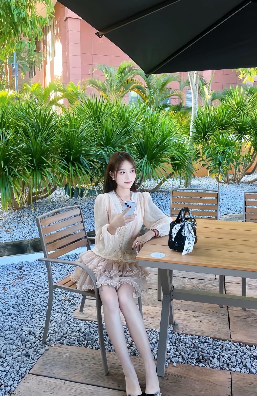 优雅甜美的少女风穿搭,咖啡馆前的清新自拍