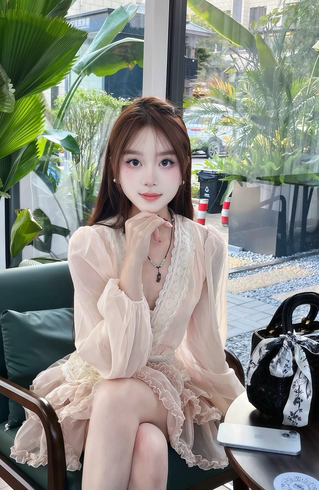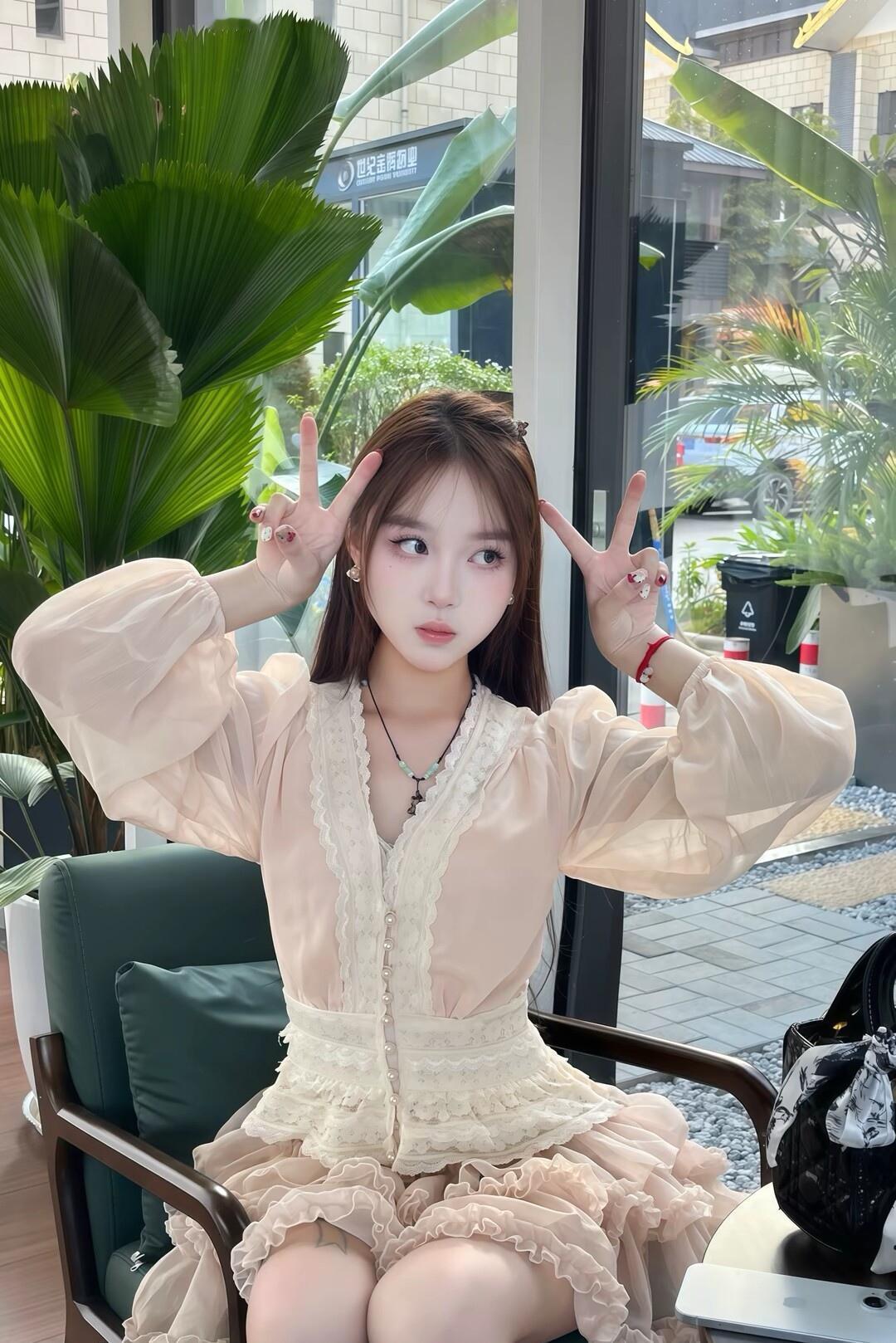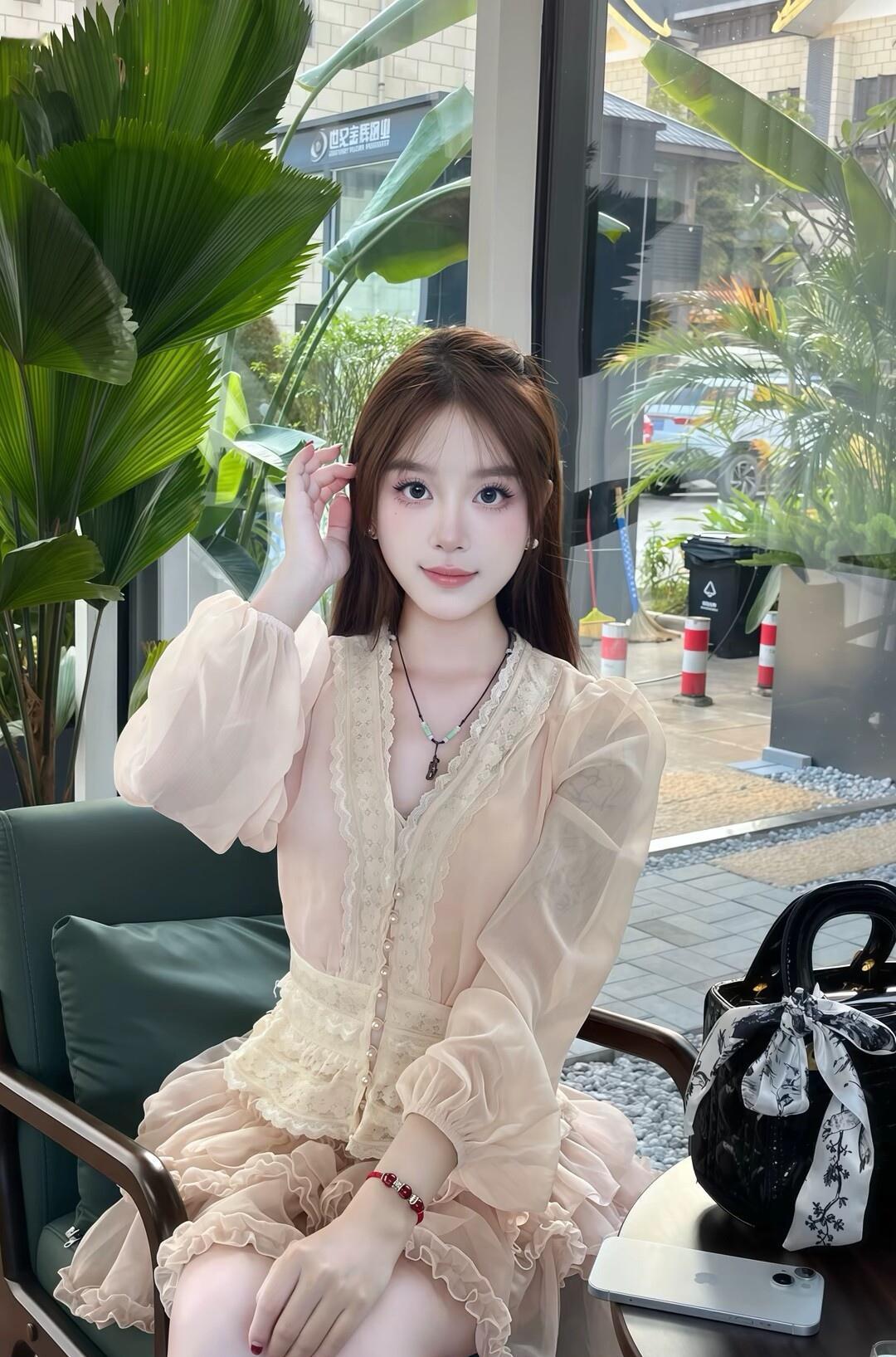 优雅甜美的少女风穿搭,咖啡馆前的清新自拍