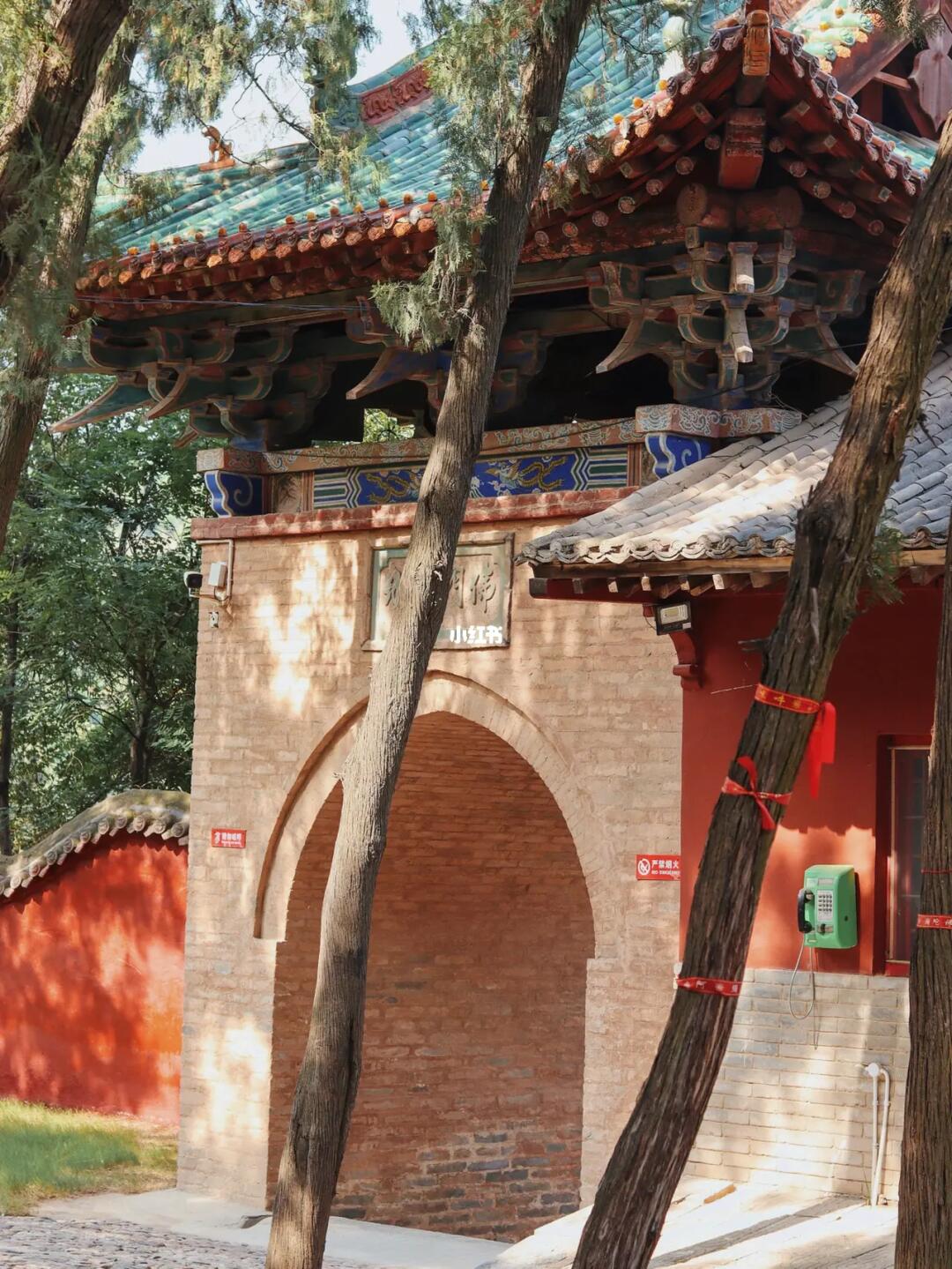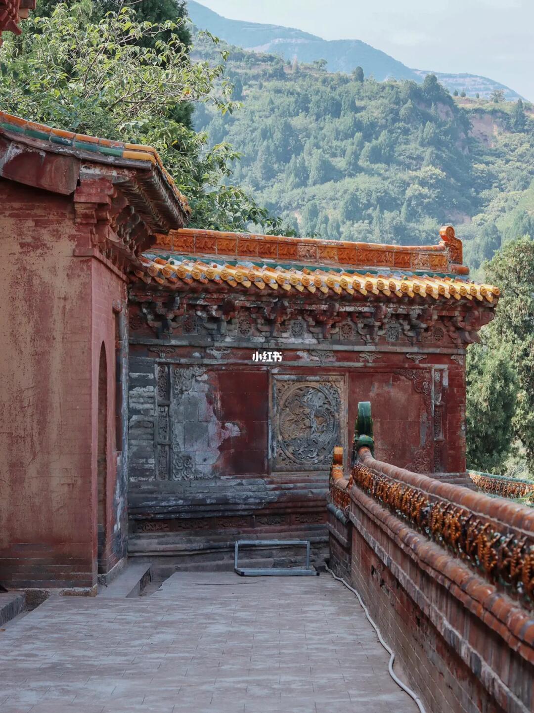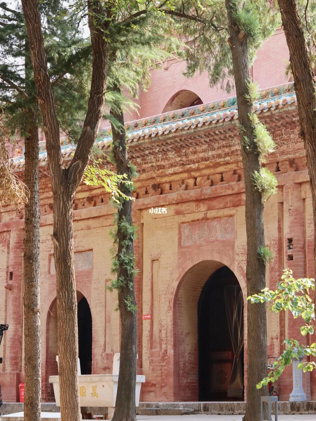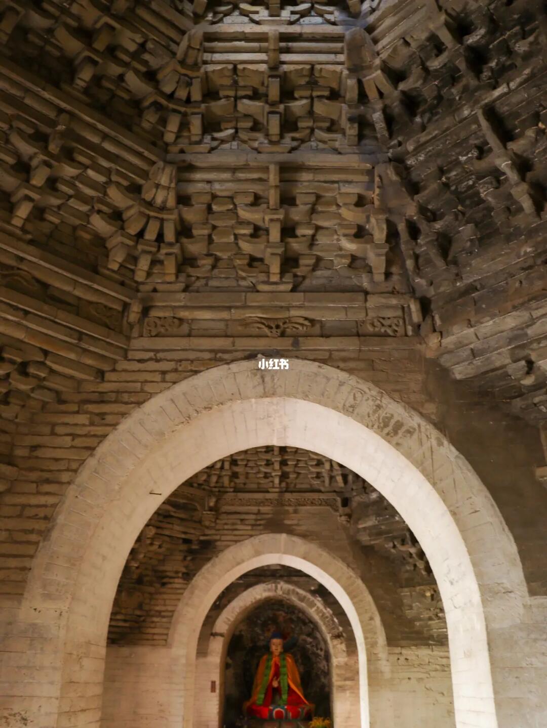 ❶无量殿:即无梁殿,整座两层的大殿没有一根大梁,完全由青砖砌成。上层三间佛堂顶部的斗拱藻井也是由仿木式青砖垒成,十分壮观。