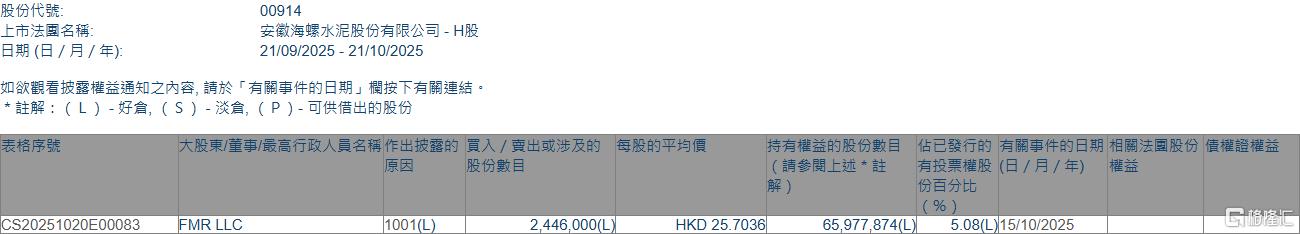 格隆汇10月21日丨根据联交所最新权益披露资料显示,2025年10月15日,海螺水泥(00914.HK)获FMRLLC在场内以每股均价25.7036港元增持244.6万股,涉资约6287.1万港元。