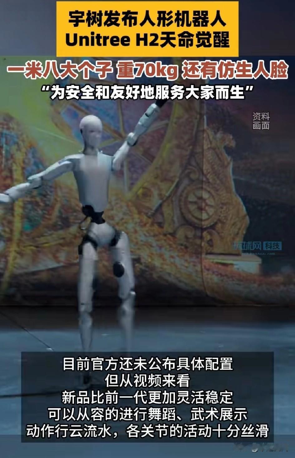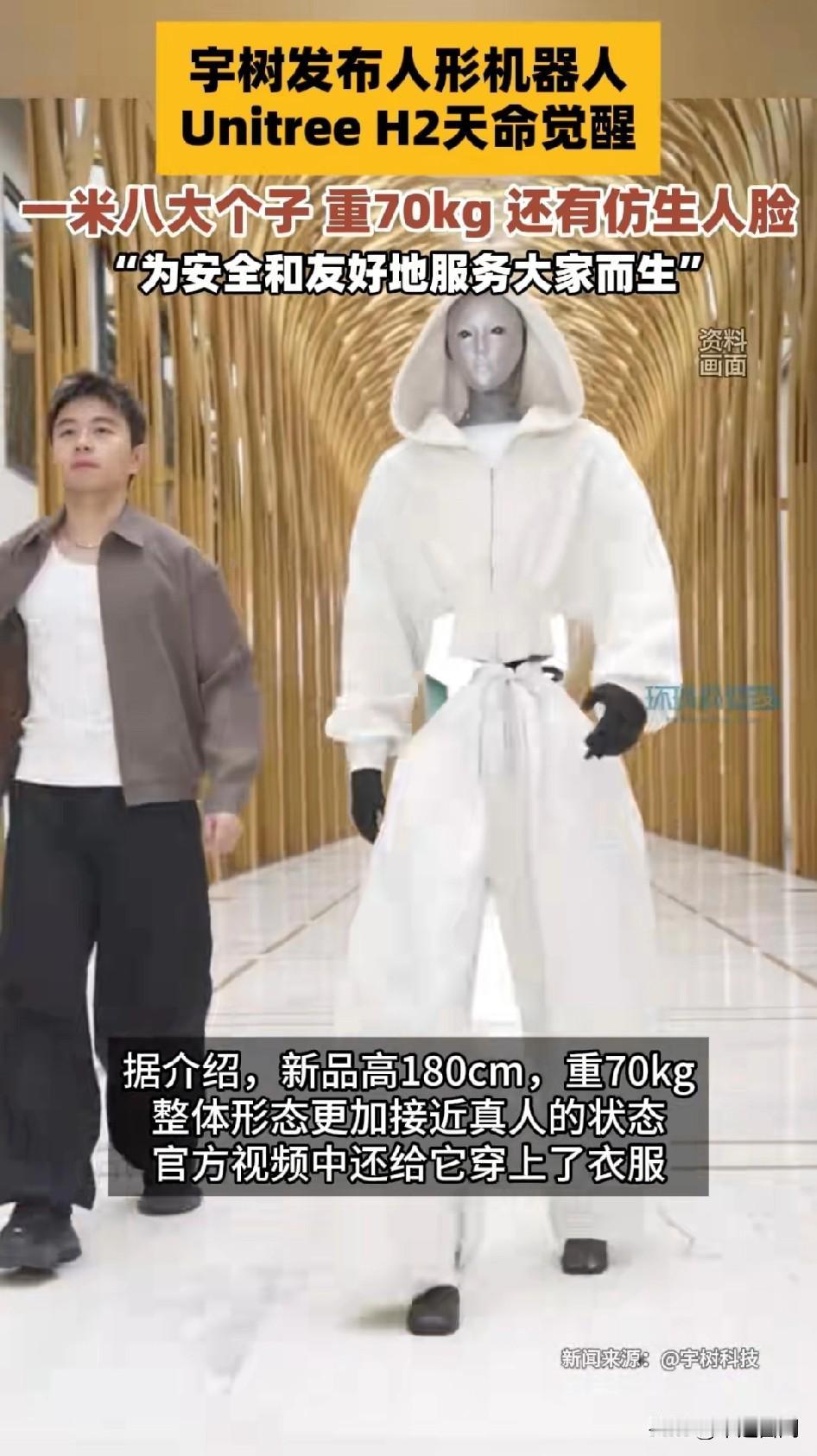 帅哥机器人走秀来了,太帅了! 近日宇树科技发布了一款叫H2的全尺寸人形机器人,它有着1米8的身高,70公斤的体重,越来越像威尔斯密斯演的电影:我机器人里的原型了,再不断迭代的话估计很快就和电影里演的一样了,机器人快有自我意识了!