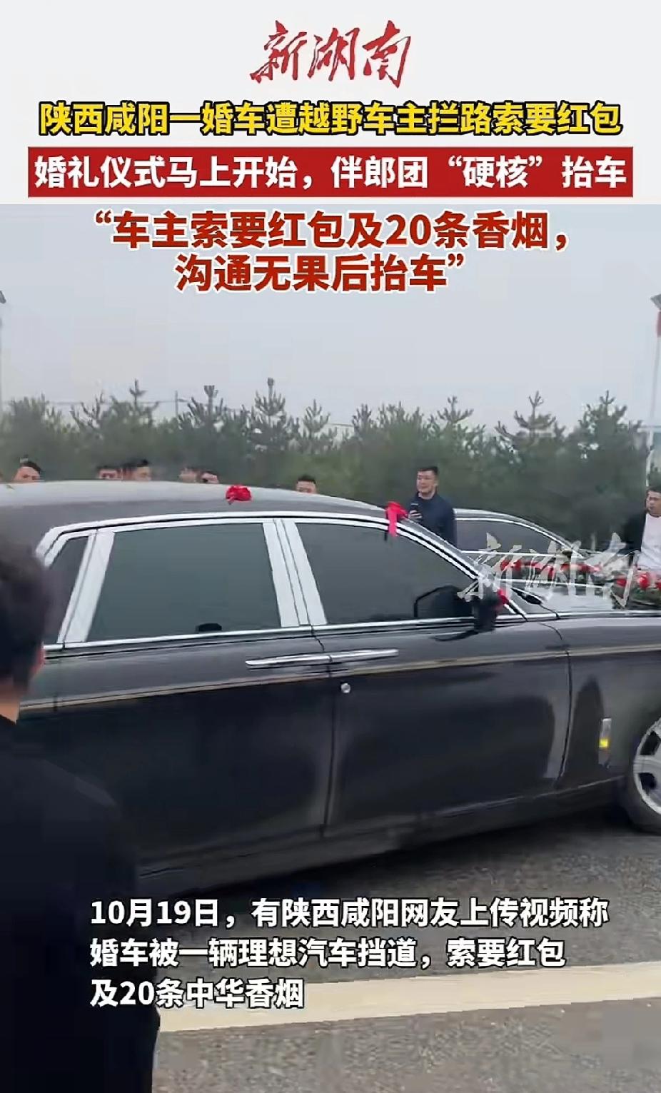 挡道拦婚车索要红包+20条华子,沟通无果后硬核伴郎团们不惯着他们,直接抬走!!! 陕西咸阳,一婚车队伍被人用越野车挡住了去路,对方索要红包,而且还要20条🚬,经过沟通无果后对方依旧不让路,于是伴郎们不再跟他们废话,直接人力把车从路中间推开。好在挪车的过程中没有损伤到车辆,要不然婚车队伍真走不了了!