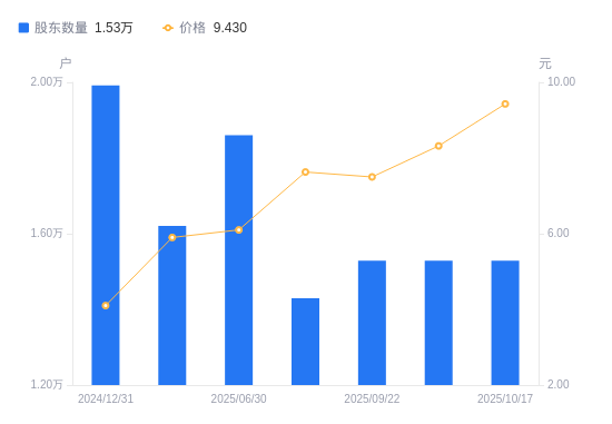 日期A股户数(户)流通A股户均持股数(股)户均持股市值(万元)2025-09-221528419517.5514.642025-09-151429420869.3315.922025-06-301860416034.529.782025-03-311620618407.1410.862024-12-311992214973.716.142024-09-302036514647.986.972024-06-302362112628.866.152024-03-312047614568.587.242024-02-082096114231.495.112024-01-202034514662.3810.34