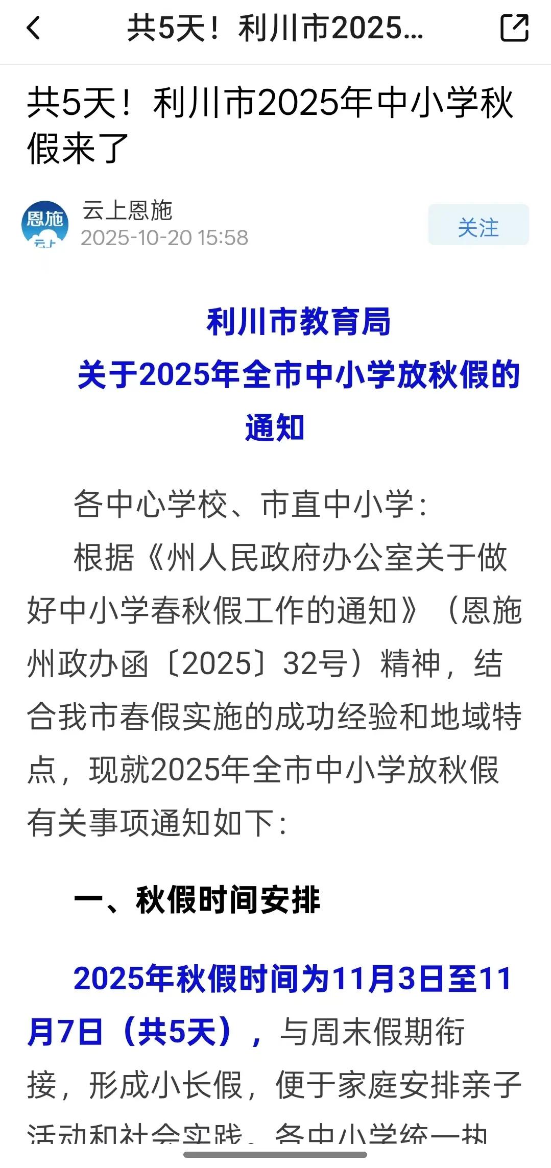 一觉醒来天都塌了,湖北一个地方秋假直接放了9天!而且还不让布置任何作业! 这是什么神仙地方啊? 湖北利川市教育局发布2025年全市中小学放暑假的通知。秋假的时间是11月3日到11月7日5天的时间,再加上前后两个周末,最长可以长达9天的小长假! 这秋假放的甚至比十一假期还要长! 更难能可贵的是,这假期不允许有任何的作业安排。 在文件当中直接说明,严禁布置任何形式的书面作业或任务性实践作业,不得要求学生提交实践报告,制作ppt等成果材料不组织考核评比不强制留痕! 同时在文件当中还提到了休假活动内容的建议 确立一个标准,以实践育人,以活动促学。 具体给出了以下几个方面的教育实践: 农事体验和丰收实践,组织学生走进农田,走进果园,参与秋收等劳动,理解春华秋实的自然规律 秋季户外运动与生态教育,鼓励学生登山远足骑行,加强体育锻炼,理解生态文明,感受秋日风光,陶冶道德情操 红色教育和家乡情怀,组织学生参观革命历史遗址,增强爱国主义情感和社会责任感 文化艺术与家庭互动,鼓励学生家庭烹饪收纳管理,参与民间艺术体验,促进亲子关系 消费体验与社会参与,鼓励开展亲子旅游,乡村体验。 全由浙江全省都实现了春秋亚的安排,现在湖北利川直接放了一个大招,不仅时间更长,而且内容更加丰富,并且还有硬性规定,不允许有任何的书面作业或者实践性作业。 湖北利川的孩子们都高兴的从梦里醒了吧?