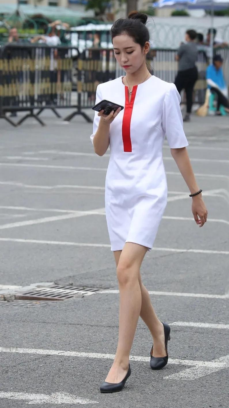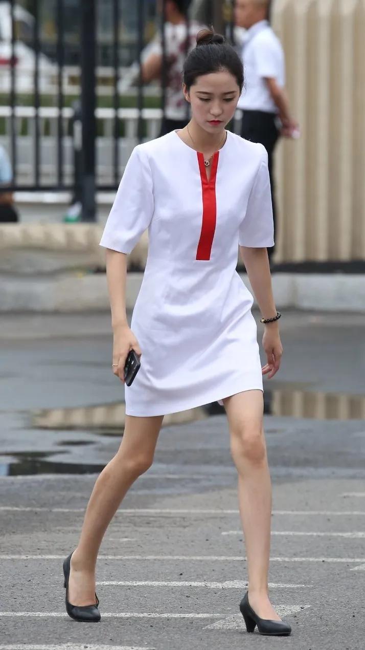 这位美女穿着白色连衣裙,站在街边。女孩子怎么穿搭既时尚又好看?