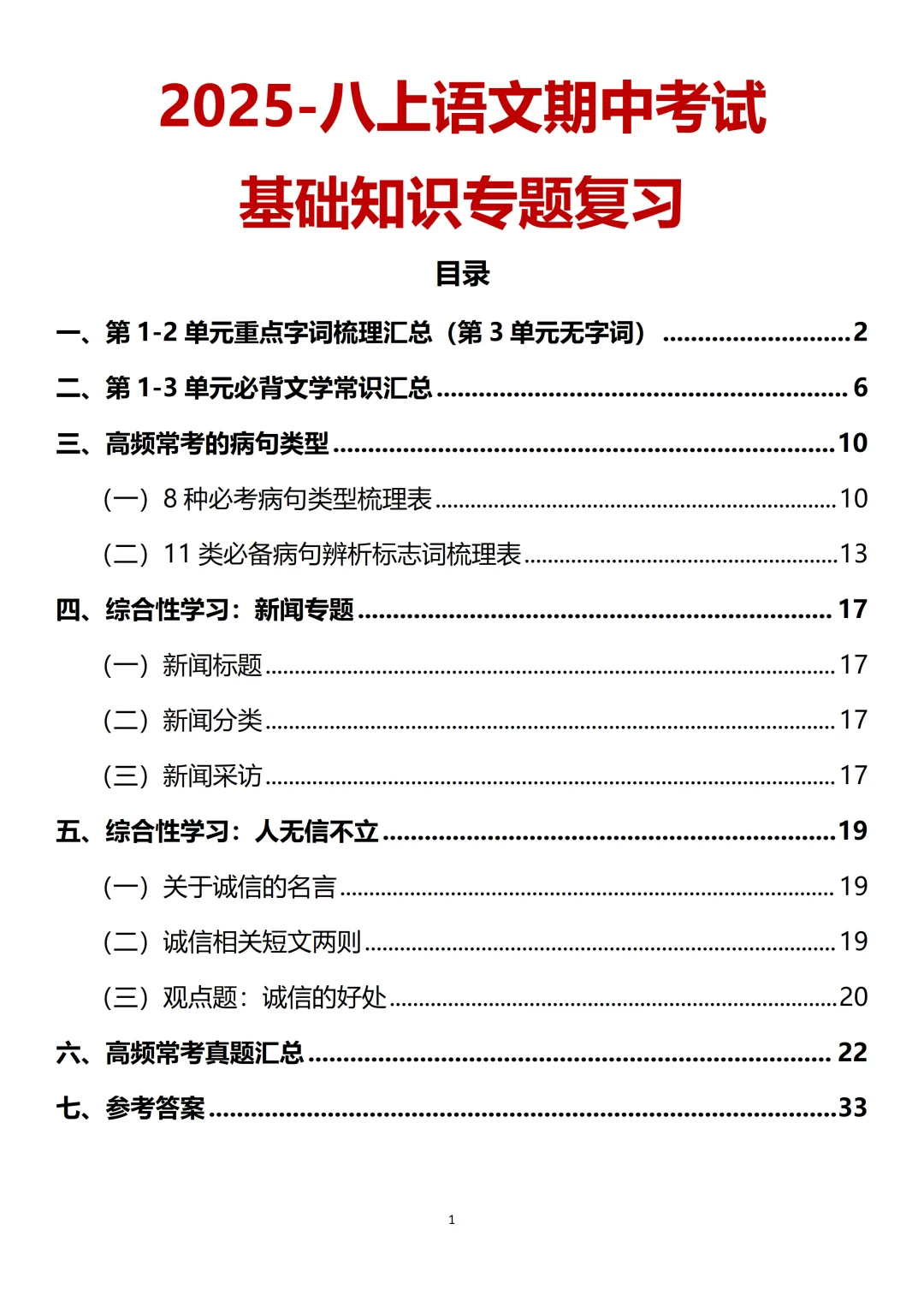 [鼓掌R]为了帮大家提前抢分,我看了几十套全国各地八上的期中考试试卷。连夜肝出这份「八上期中考试基础知识专题汇总」,从5类必考点到30道真题全覆盖。语文要想得高分,基础板块必须拿下!