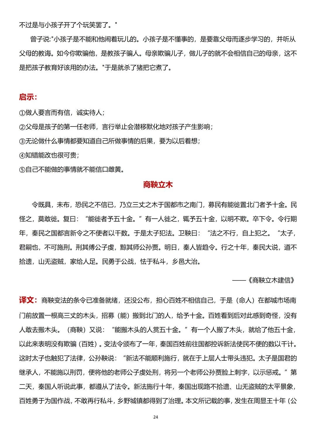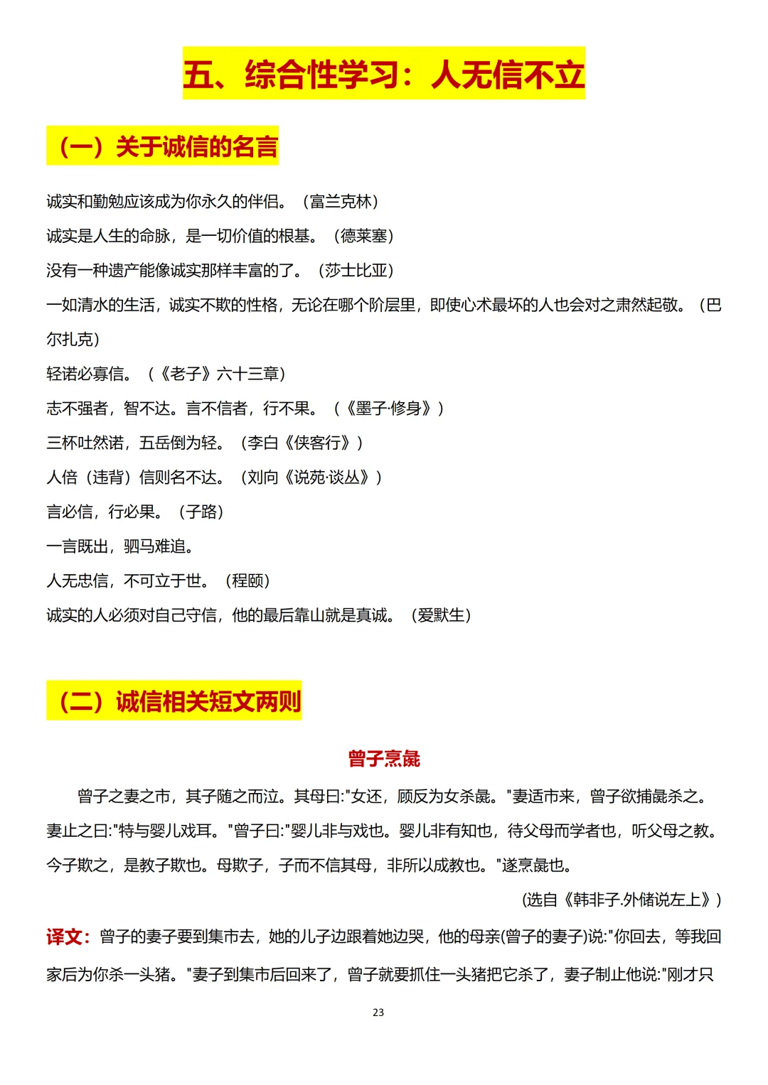 这个板块需要大家积累与诚信有关的名言,曾子烹彘和商鞅立木两则诚信短文的译文和启示。还要学会答与诚信有关的观点题,我提供了8个答题方向给大家参考。