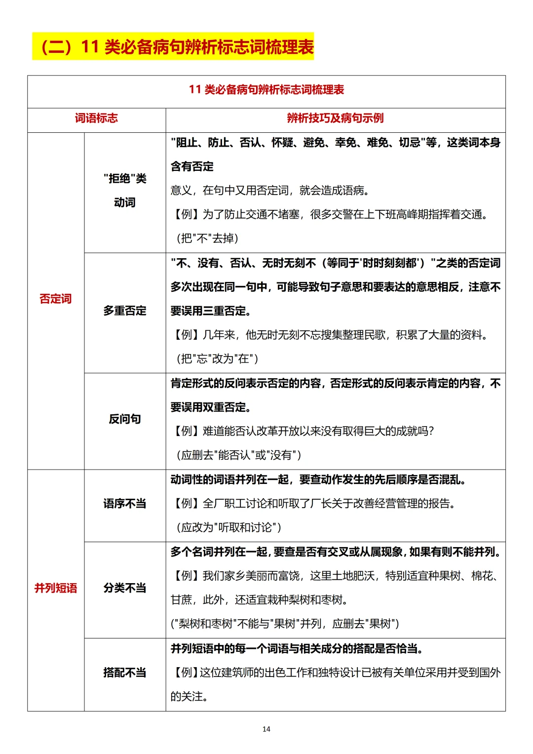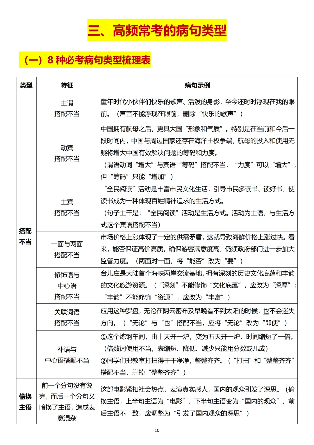 老师整理了8种必考病句类型梳理表和11类必备病句辨析标志词梳理表,摸清套路,修改病句就不再困难。
