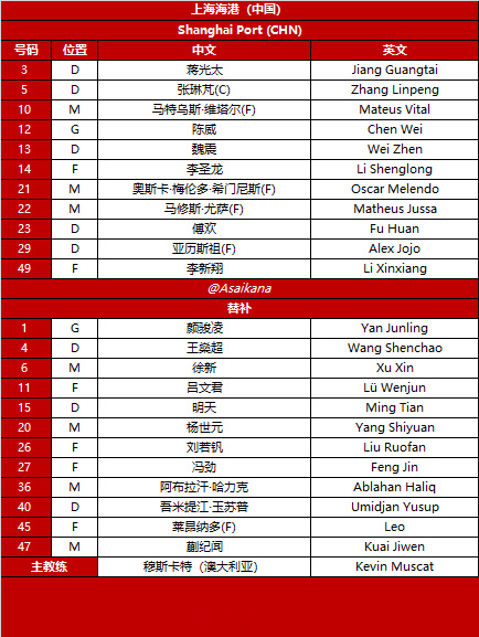 虎扑10月21日讯亚冠精英联赛第3轮上海海港vs町田泽维亚将于20:15开战,赛前双方公布了首发名单。