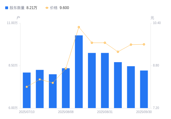 日期A股户数(户)流通A股户均持股数(股)户均持股市值(万元)2025-09-30820978941.818.582025-09-19846128676.028.322025-09-10870198432.947.862025-08-31924357938.837.672025-08-29924357938.837.672025-08-201027667140.757.322025-08-08834358795.187.642025-07-31798869185.917.492025-07-18824548899.827.372025-07-10808899072.017.26