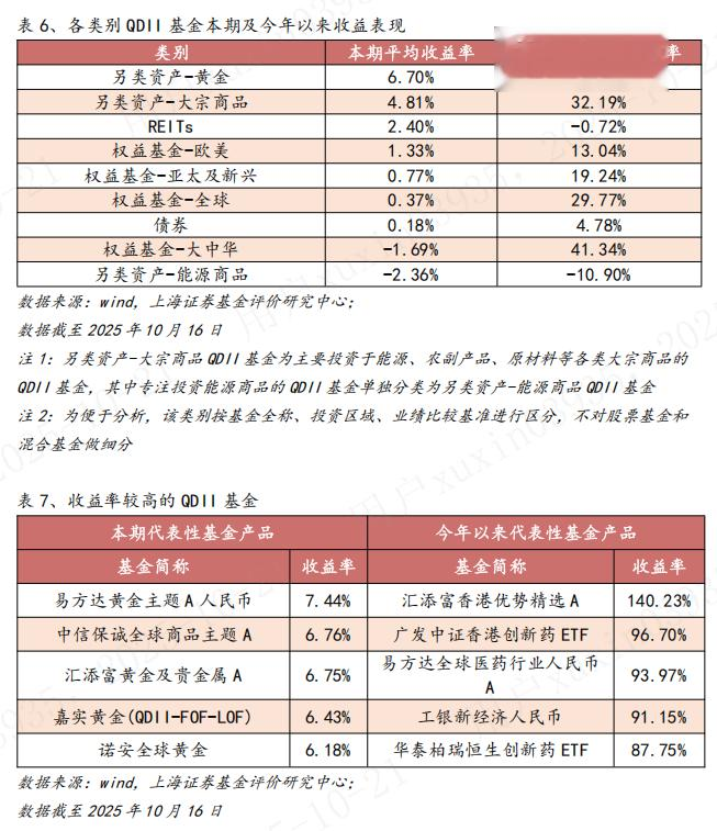 本期各类QDII基金涨多跌少。另类资产-黄金类QDII基金本期上涨6.70%;另类资产-大宗商品类QDII基金本期上涨4.81%;REITs类QDII基金本期上涨2.40%;权益基金-欧美类QDII基金本期上涨1.33%;权益基金-亚太及新兴类QDII基金本期上涨0.77%;权益基金-全球类QDII基金本期上涨0.37%;债券类QDII基金本期上涨0.18%;权益基金-大中华类QDII基金本期下跌1.69%;另类资产-能源商品类QDII基金本期下跌2.36%。今年全年来看,另类资产-黄金类QDII基金涨幅较大,为59.30%。