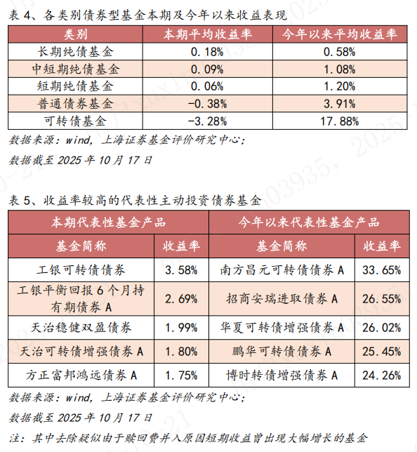 本期各类债券基金涨多跌少。从基金类别上看,本期长期纯债基金上涨0.18%;中短期纯债基金上涨0.09%;短期纯债基金上涨0.06%;普通债券基金下跌0.38%;可转债基金下跌3.28%。从今年收益综合来看,可转债基金业绩表现较好,平均收益率为17.88%。