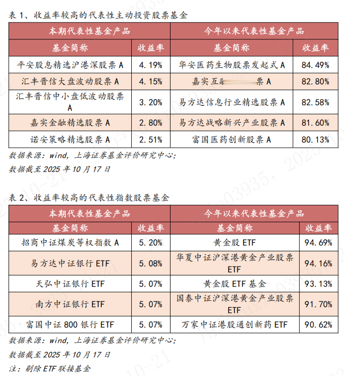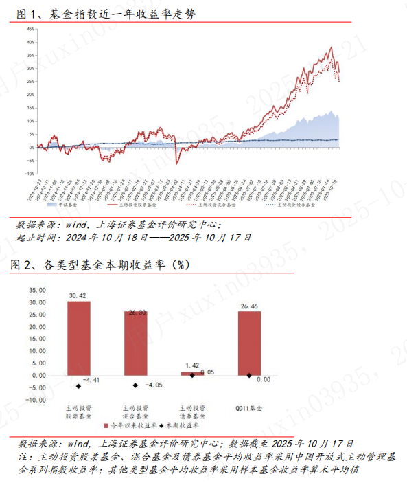 本期(2025.10.13-2025.10.17)上证指数下跌1.47%,深证成指下跌4.99%。申万一级行业跌多涨少,其中银行和煤炭行业表现较好。海外权益市场重要指数涨多跌少,国际黄金价格上涨。本期各类型基金多下跌。主动投资股票基金较上期下跌4.41%,主动投资混合基金下跌4.05%,主动投资债券基金上涨0.05%;QDII基金较上期持平。