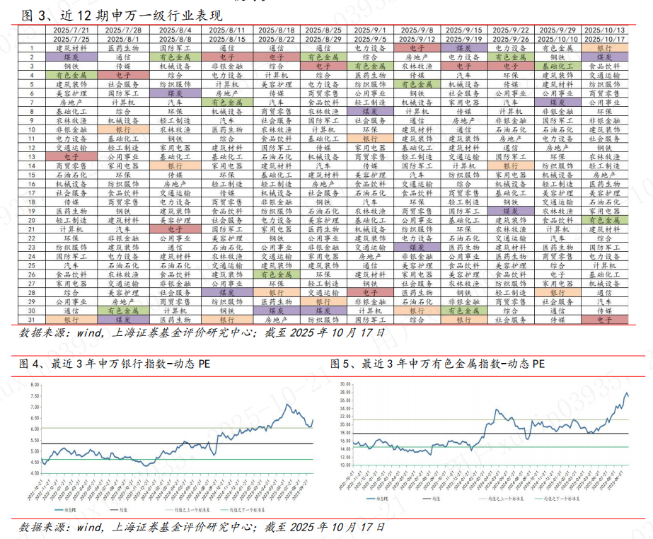 本期申万一级行业跌多涨少,其中银行和煤炭表现较好。从最近12期申万一级行业综合表现来看,有色金属和电子表现较好。