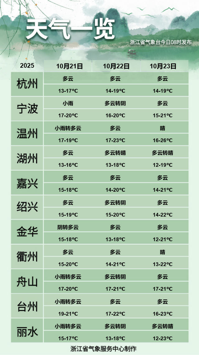 10月24日:沿海地区多云,其他地区多云到晴。10月25日:浙北和沿海地区多云到阴局部有小雨,其他地区多云。10月26日:全省多云。10月27日:全省多云转阴。10月28-30日:浙南地区多云到阴;其他地区多云。