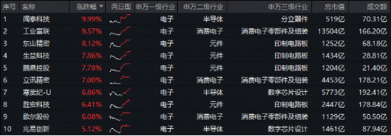 细分方向来看,芯片产业链持续走高,此前遭受荷兰不公正对待的闻泰科技午后涨停,三季报业绩亮眼的寒武纪涨超6%;苹果产业链强势上攻,工业富联涨超9%,立讯精密涨逾7%,歌尔股份涨逾6%;PCB(印制电路板)亦有亮眼表现,东山精密涨超8%,生益科技、鹏鼎控股涨逾7%。