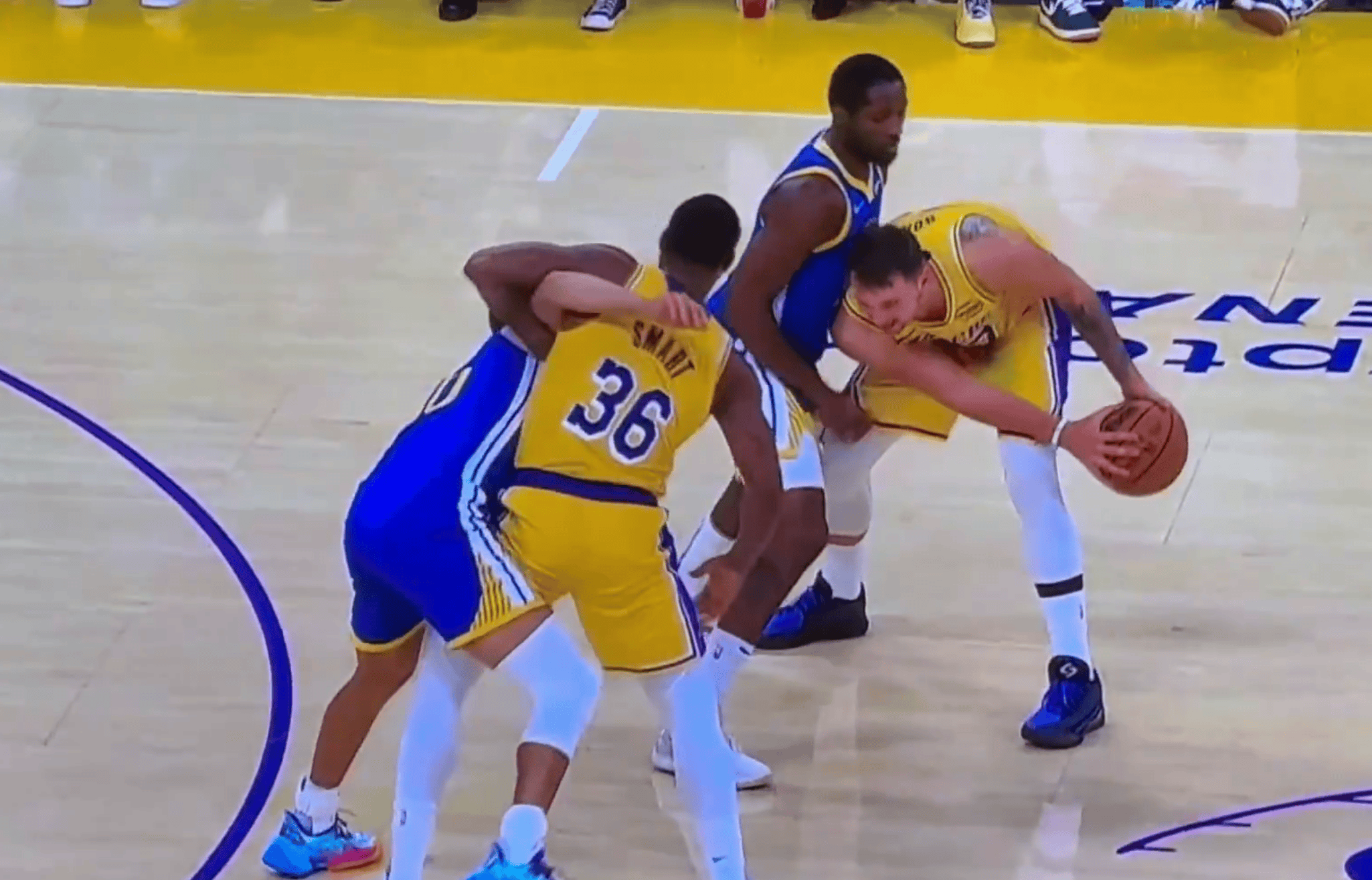 第二节比赛,斯马特卡位时夹臂放倒库里,裁判回看后吹罚斯马特一级恶意犯规。