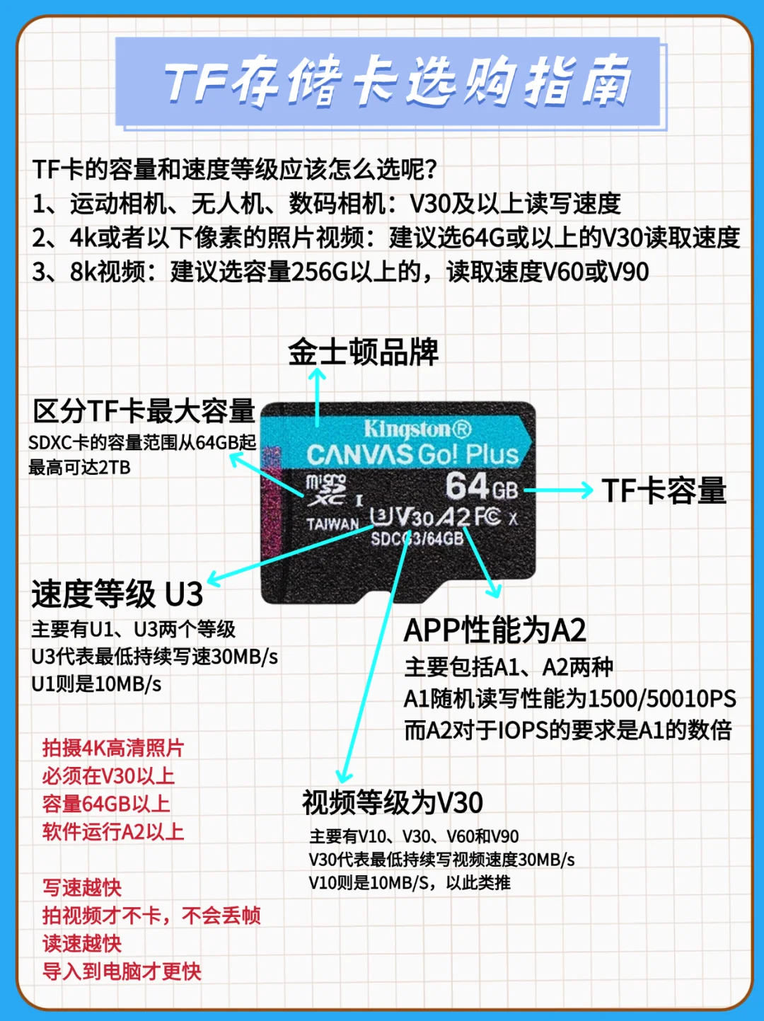 ✔️4k或者以下像素的照片:建议选64G或以上的V30读取速度