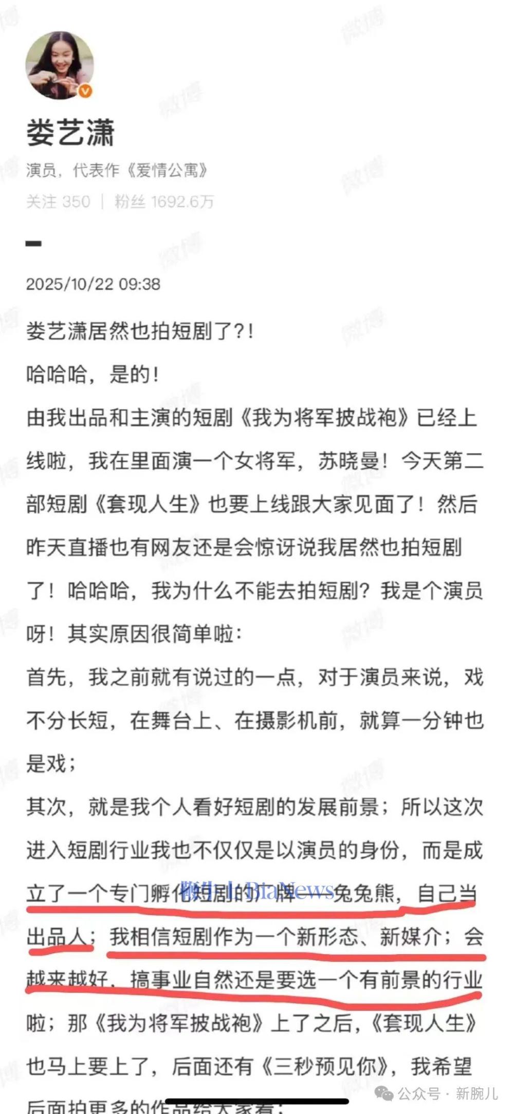 在娄艺潇发布的这段内容中,虽然开头结尾都在介绍其新上线的两部短剧,做对应的宣传,不过,也给到自己关于短剧近况的介绍。