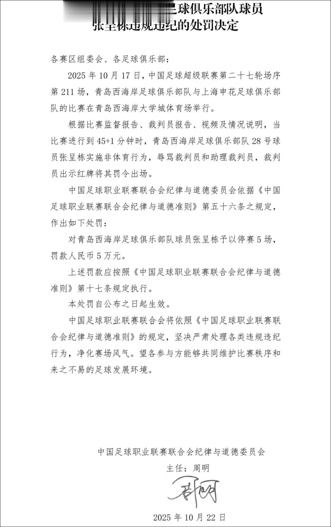 对青岛西海岸足球俱乐部队球员张呈栋予以停赛5场,罚款人民币5万元。