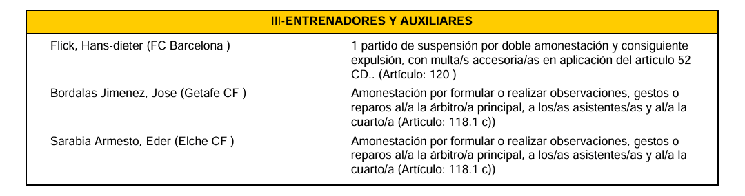 弗里克在上周末西甲第9轮巴萨2-1吉罗纳的比赛中,于补时第91分钟两黄变一红离场。根据主裁判希尔-曼萨诺的赛后报告,第90分钟向弗里克出示的第一张黄牌原因是“以鼓掌的方式对我的一项判罚表示抗议”。紧随其后的第二张,原因是“在被黄牌警告后,做出了一个表示不满的手势”。