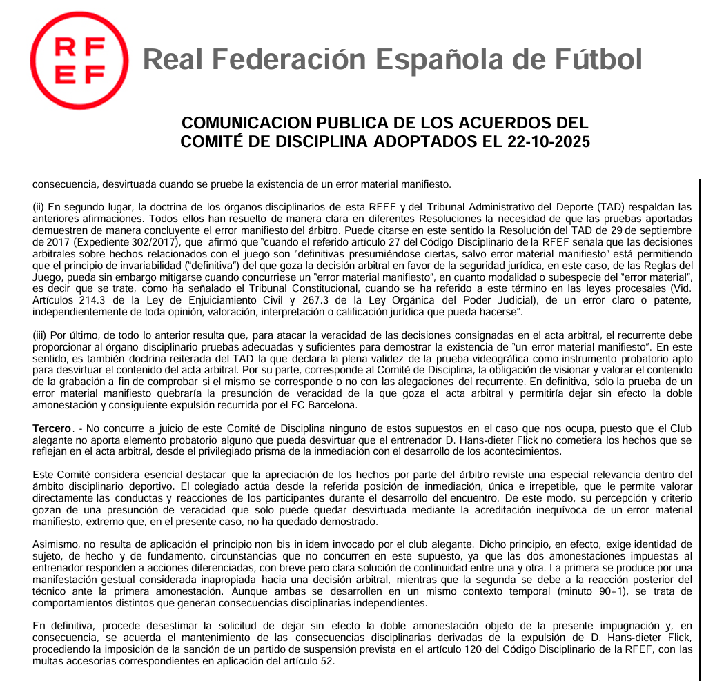 西班牙皇家足协纪律委员会在当地时间10月22日周三正午公布了西甲第9轮的判罚复核结果,其中对于巴萨主教练汉斯-弗里克的红牌维持原判,按规定停赛一场外加罚款,无缘周末的国家德比。