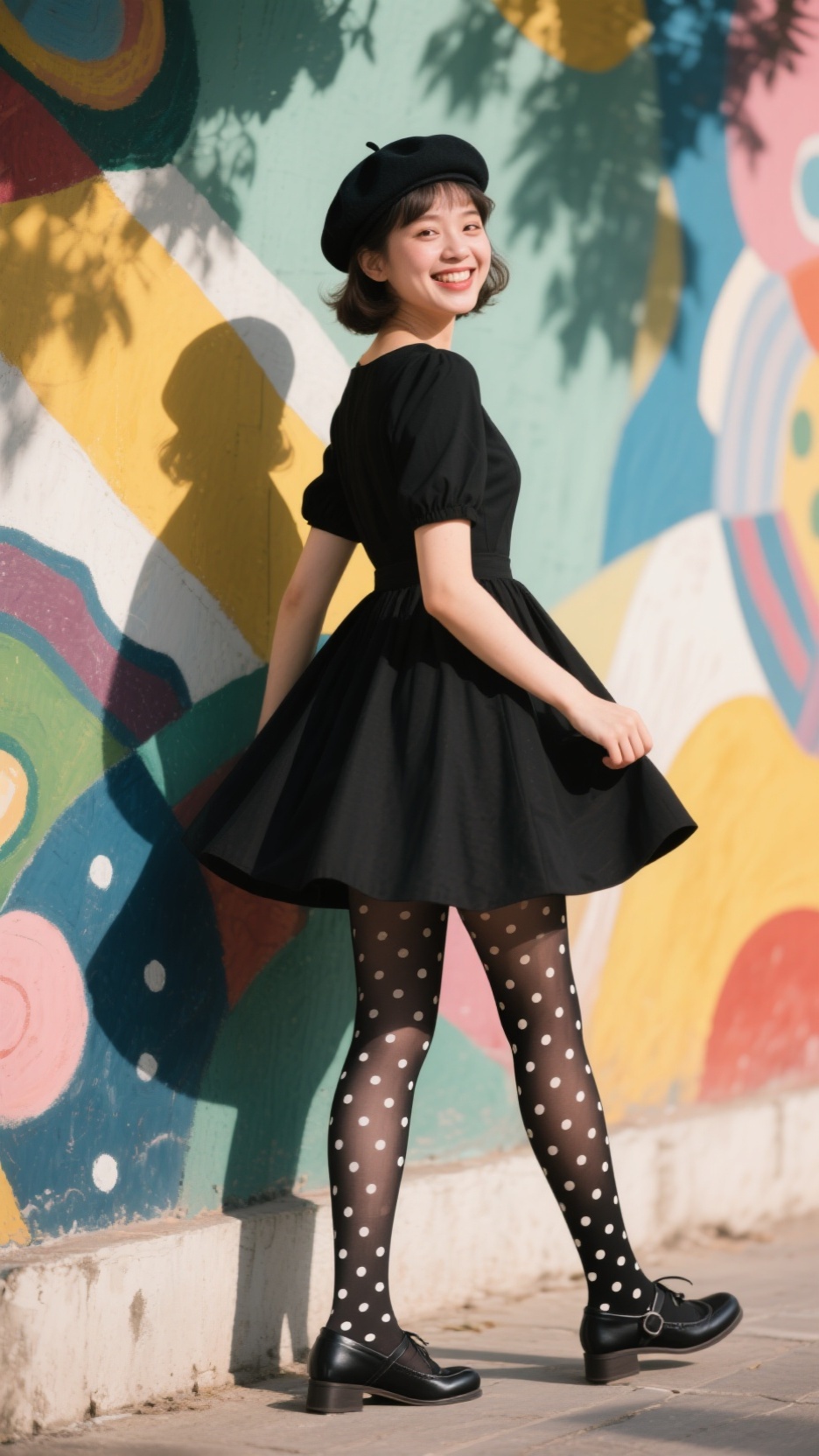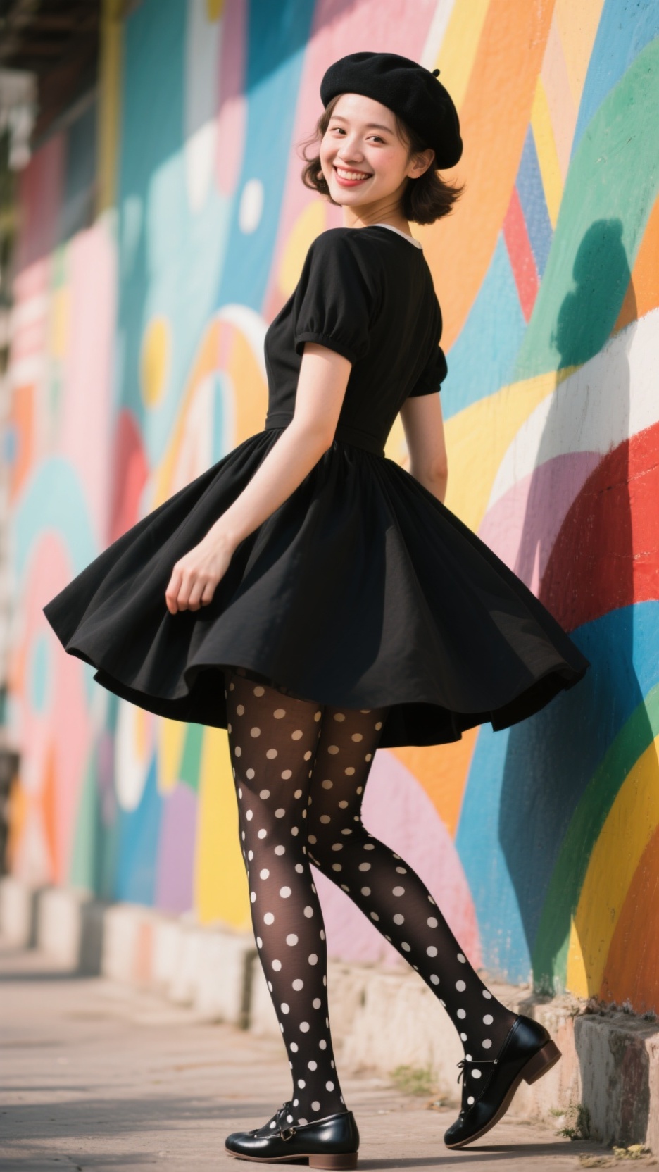 A字摆黑色连衣裙+头戴贝雷帽+黑色薄纱底+白色小波点黑丝袜[眯眼睛笑]