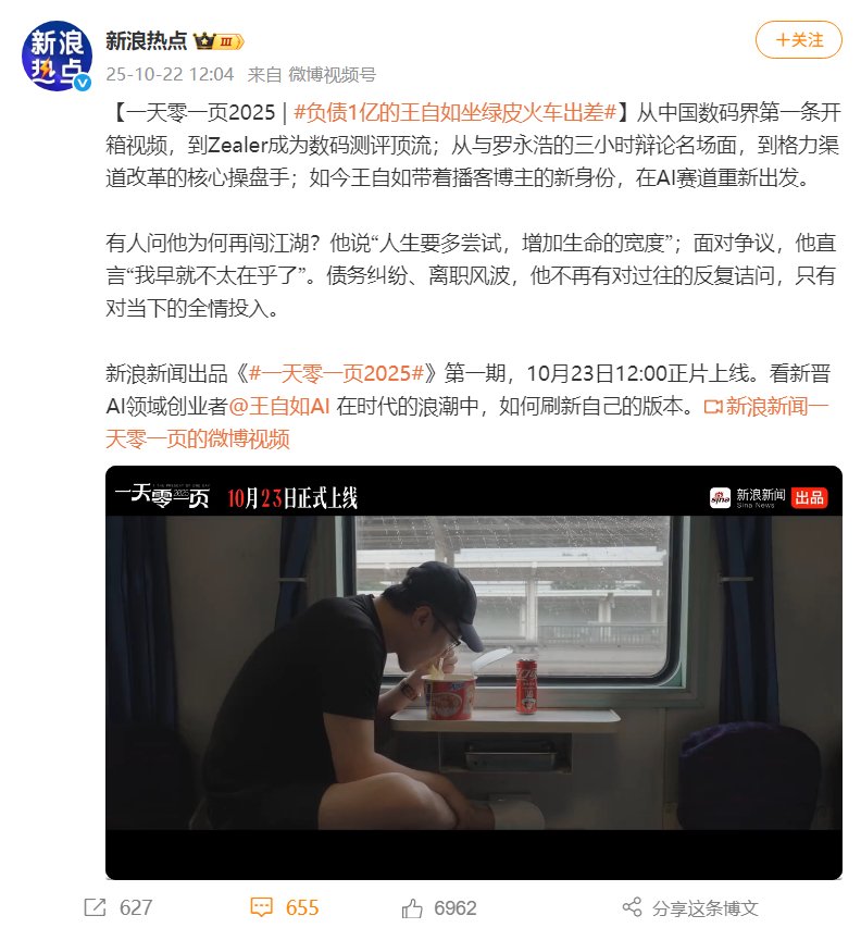 [王自如自曝负债1个亿,出差只能坐绿皮火车]10月22日消息,新浪新闻今日发布《一天零一页2025》栏目预告片,王自如在片中乘绿皮火车出行,称因限高只能选择这种出行方式。视频中,王自如称创业首要目标是“还钱”,透露要全部解决对所有股东的回购邀约需要“小一个亿”。