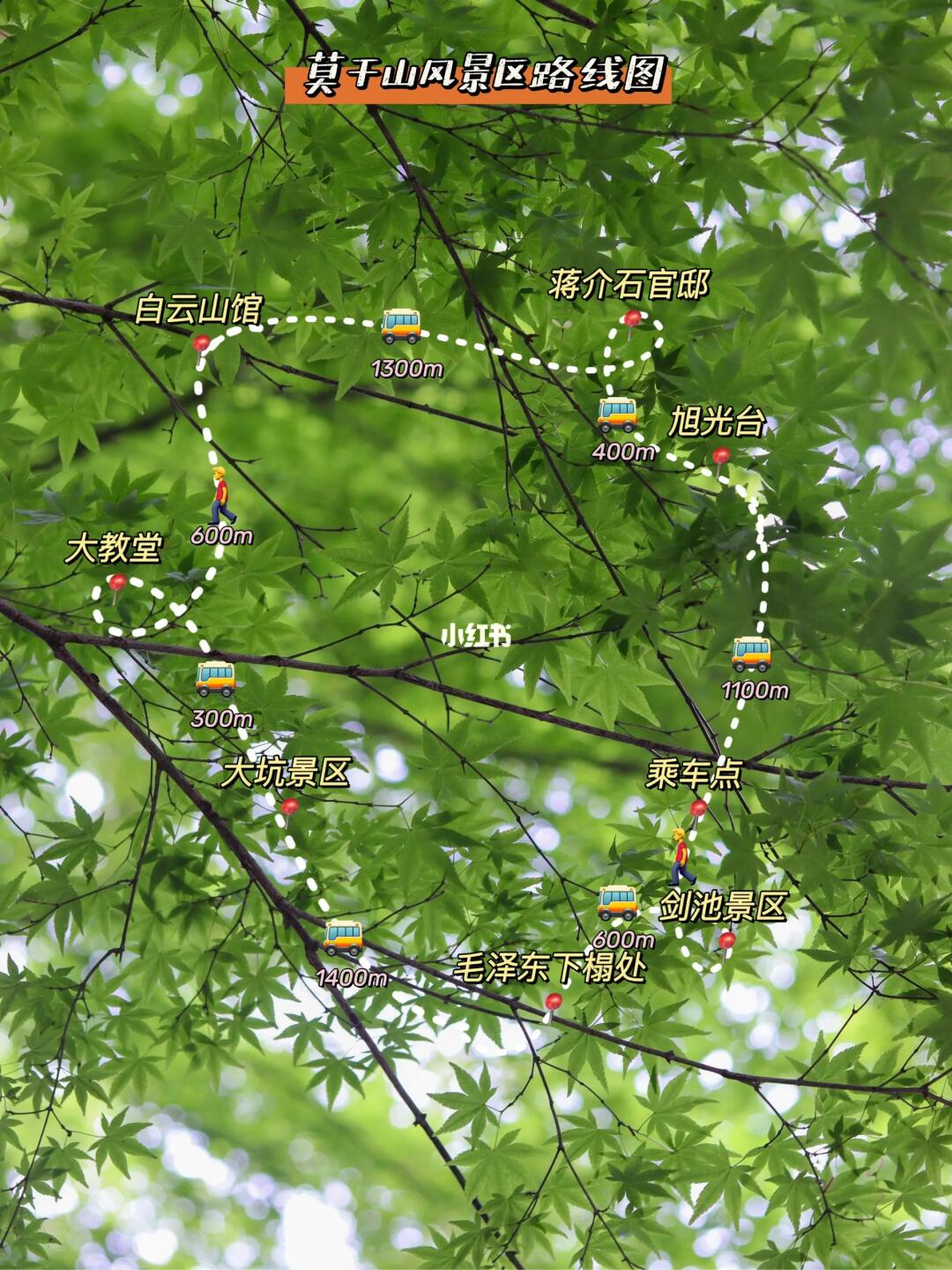 莫干山旅游集散中心—换乘中心(🚌)—毛泽东下榻处(🚌)—旭光台(🚌)—蒋介石官邸(🚌)—白云山馆(🚶)—莫干山泉水(🚶)—陈毅纪游词(🚶)—芦花荡公园(🚶)—十二生肖园(🚶)—大教堂(🚌)—大坑景区(🚌)—换乘中心(🚶)—剑池景区(🚶)—换乘中心(🚌)—莫干山旅游集散中心