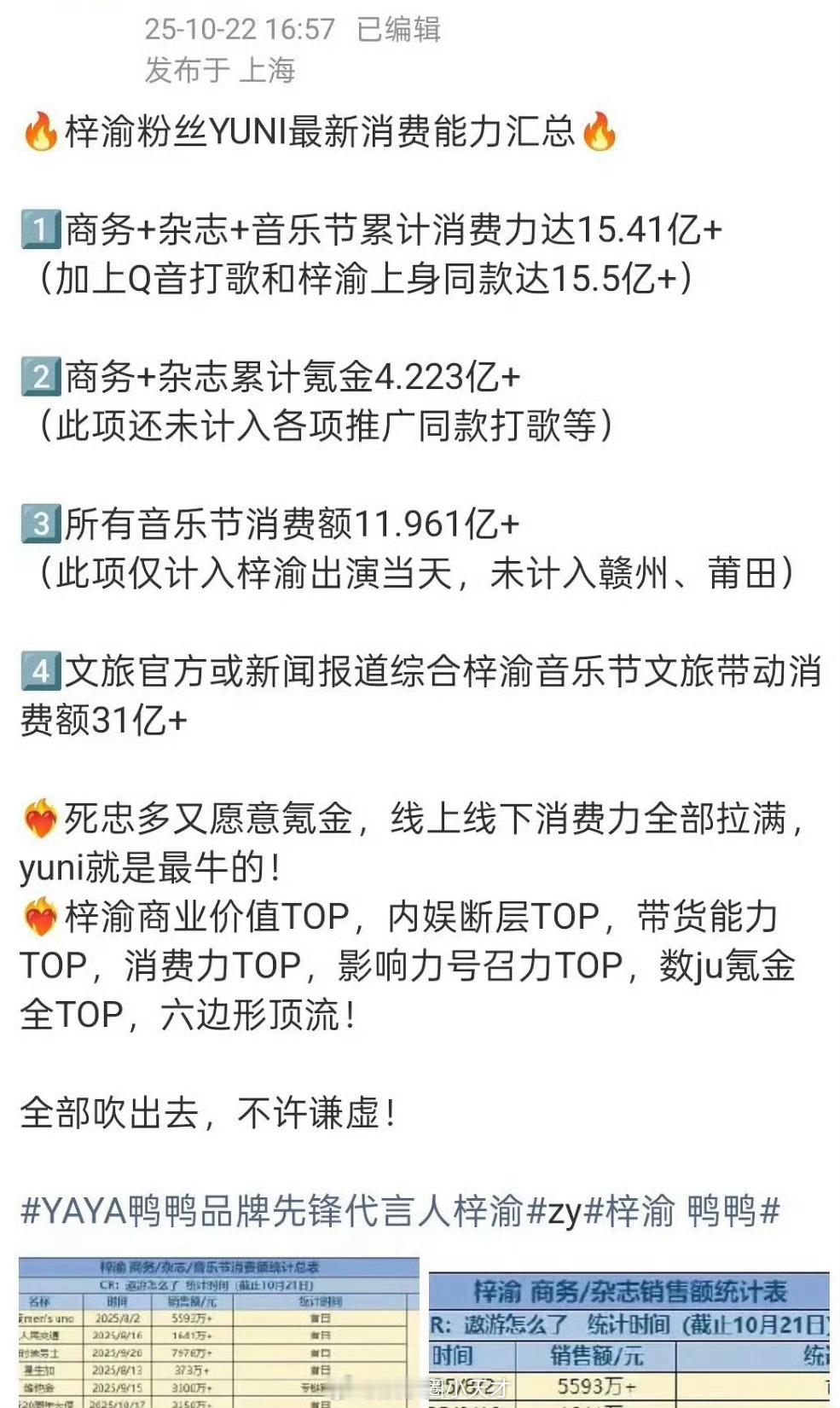 梓渝参加的8场音乐节,带动的消费额加一起有31亿+!!怪不得这么多音乐节抢着要他!有一说一,YUNI的氪金能力算得上内娱Top级了吧!梓渝[超话]