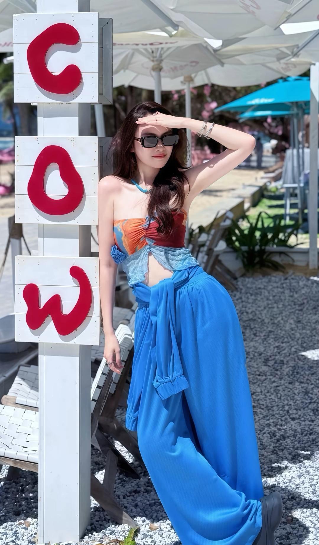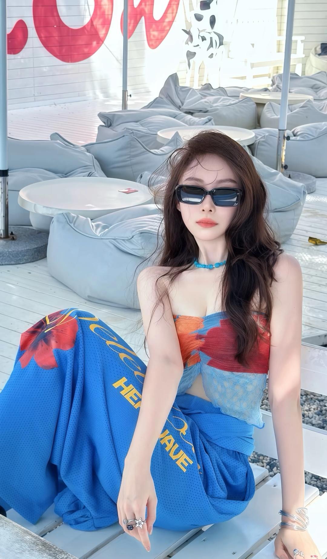 阳光明媚,海滩上美女拍照。