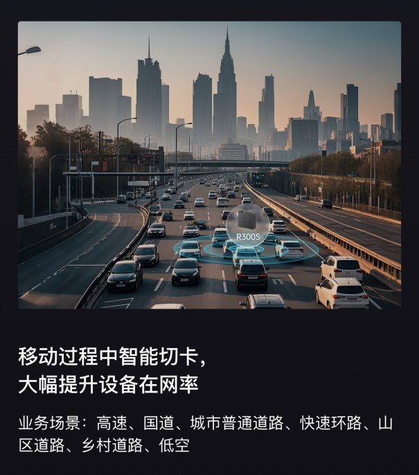 在移动场景下,如高速、国道、城市普通道路、山区道路或低空巡检等复杂环境中,R300S的三网通卡可实现智能切卡,在行驶、巡检或移动作业过程中保持网络不断线。