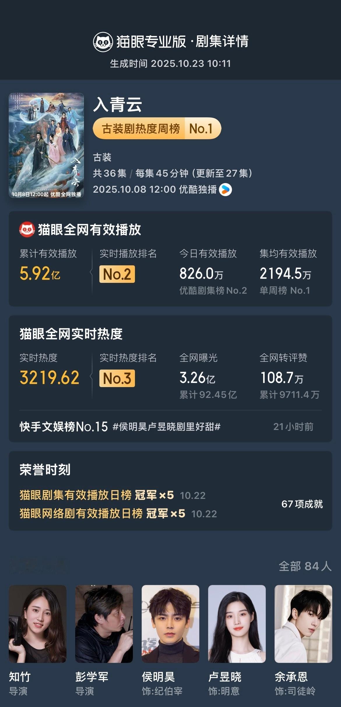 入青云[超话]入青云累计5次获得剧集有效播放日冠 据猫眼专业版,由 领衔主演的网