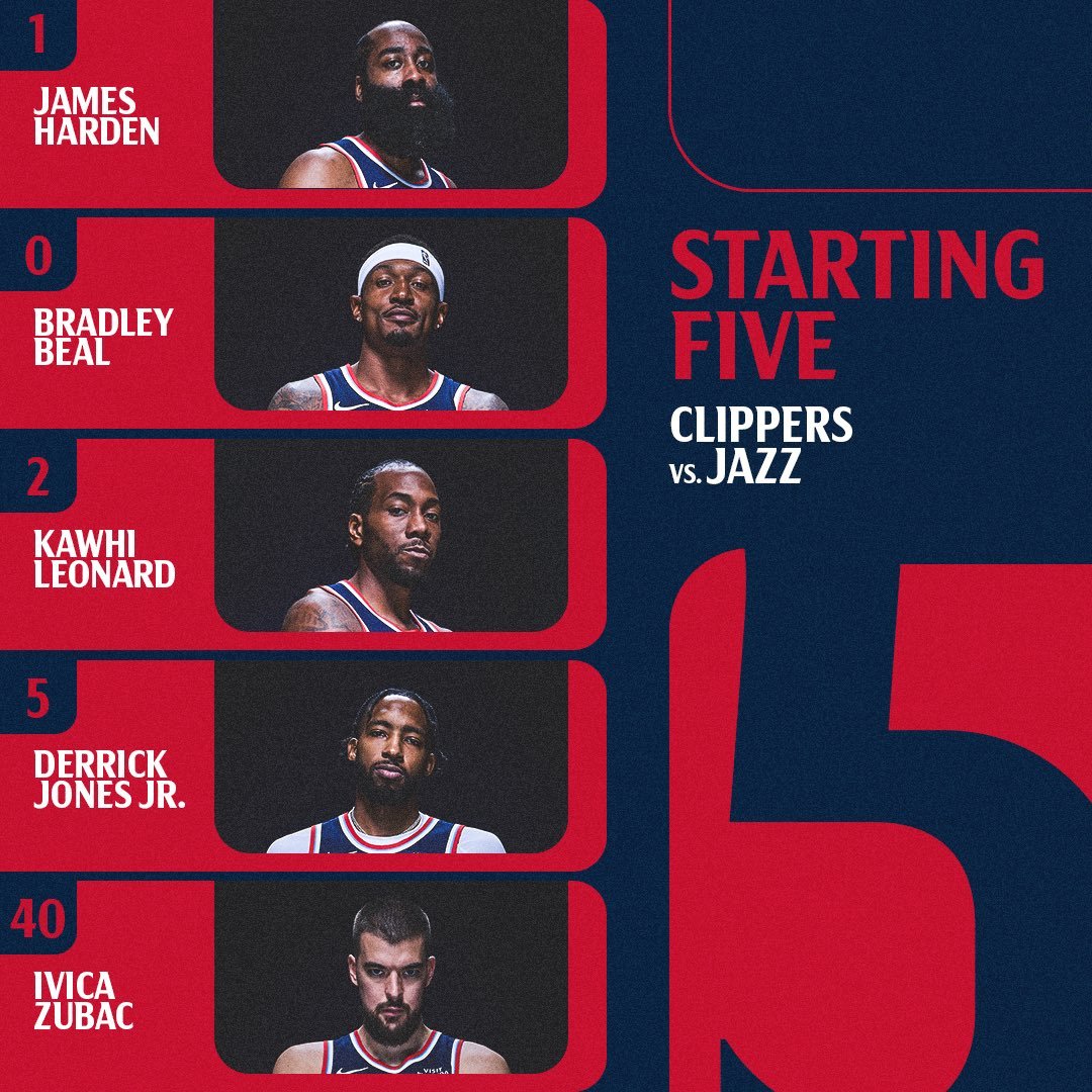 首发:小卡+哈登+比尔+琼斯+祖巴茨快船vs爵士nba新赛季第一声加油