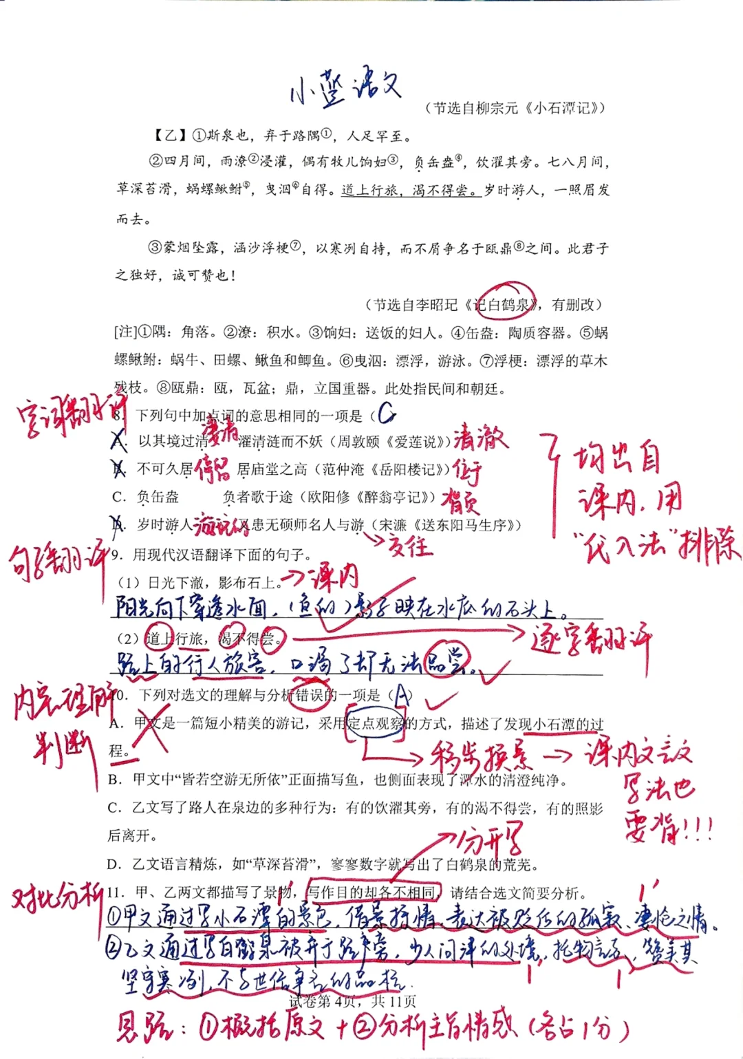 [八R]文言文阅读注重课内知识迁移,熟练掌握每一篇课内文言文的重点实词、虚词、句式、写作内容、写作手法、主旨情感,句子翻译题坚持“逐字翻译”原则。做对比阅读题时,问“不同点”就分开写,写对课内文章至少能拿一半的分数。