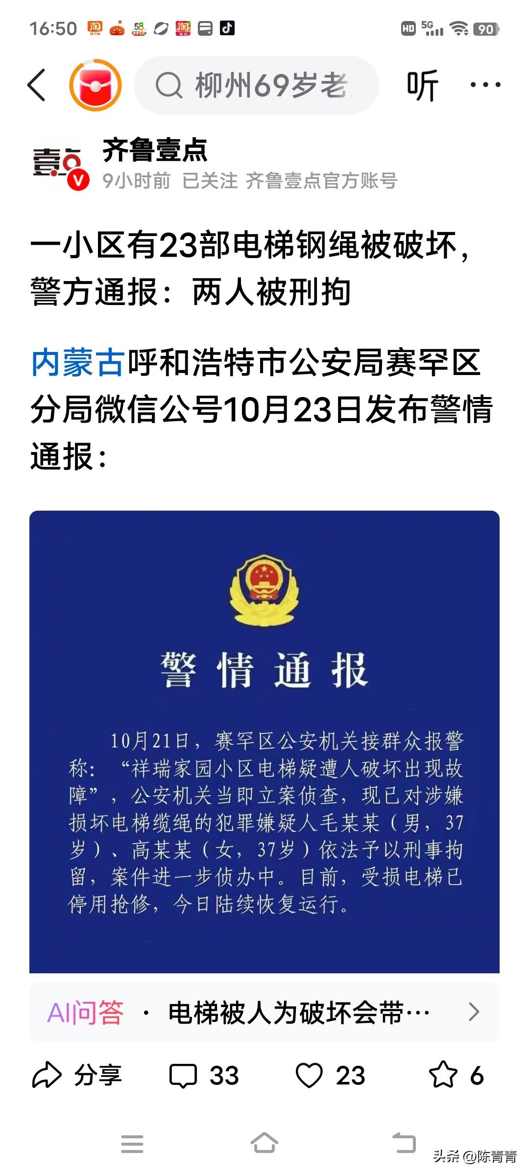 这是跟电梯有仇?人为切割电梯轿厢钢绳,这又不能卖废铁。如若排查发现不及时,很容易造成电梯坠落事故,这可是人命关天的大事! 这两个人毁坏电梯的目的是啥?太不拿人命当回事了。电梯的监控,这胆子太大了。看看怎么处理吧?