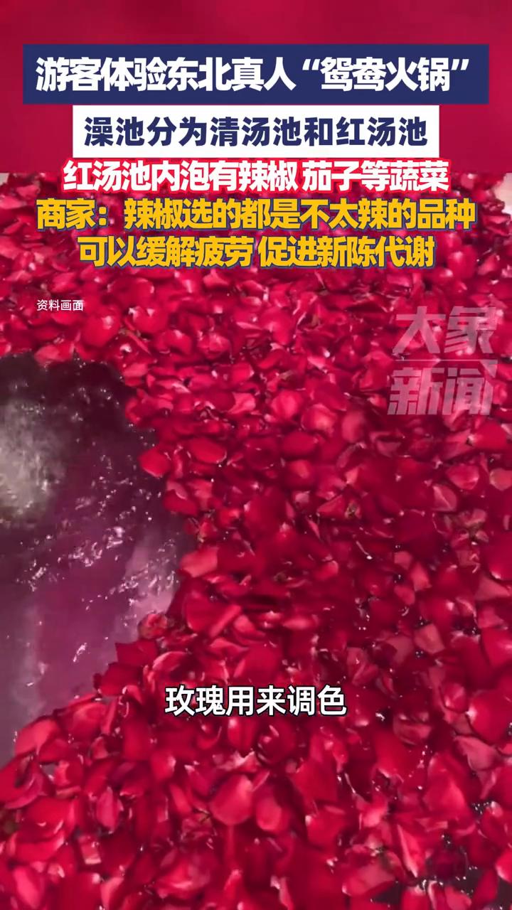 游客体验东北真人"鸳鸯火锅",汤池里放有真辣椒。 大象新闻主播蒋子豪。 10月22日报道,游客体验东北真人"鸳鸯火锅"。泡澡池子一分为二,有清汤池和红汤池。红汤池里放有辣椒和玫瑰,玫瑰用来调色,等汤底变红之后捞出。辣椒选的都是不太辣的品种,可以缓解疲劳、促进新陈代谢。水面上还漂浮着茄子、白菜等蔬菜,乍一看真像是"铁锅炖自己"。