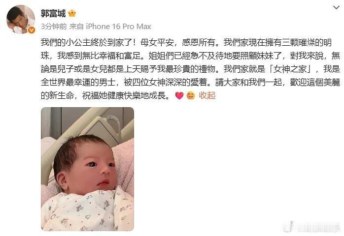 郭富城花甲之年再添千金,眼睛大大的真可爱! 虽然郭富城已经要过花甲,但并不妨碍添丁进口,在自己60岁生日之前喜得千金,也算是双喜临门,不对,是三喜临门!因为郭富城六十岁不用买门票了[笑哭][笑哭][笑哭],以后去景区玩,只需要买方媛一个人的。 最后还是恭喜郭富城和方媛,喜得千金。 秋日生活打卡季 郭富城 郭富城三女儿 郭富城方媛