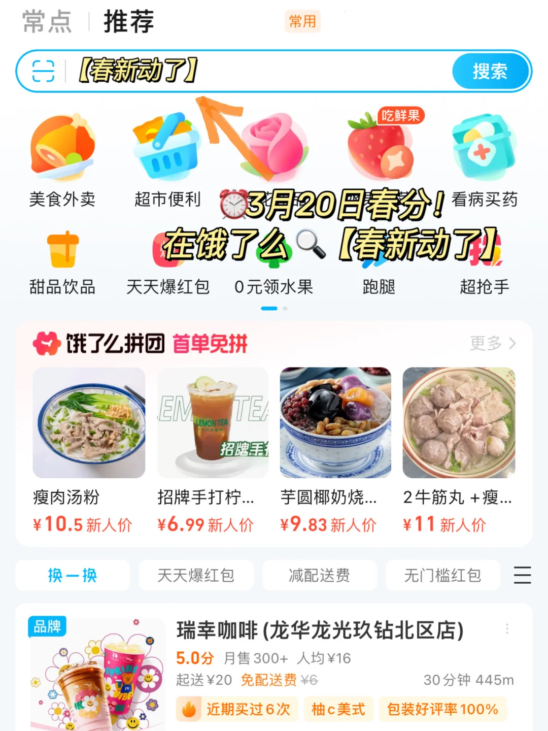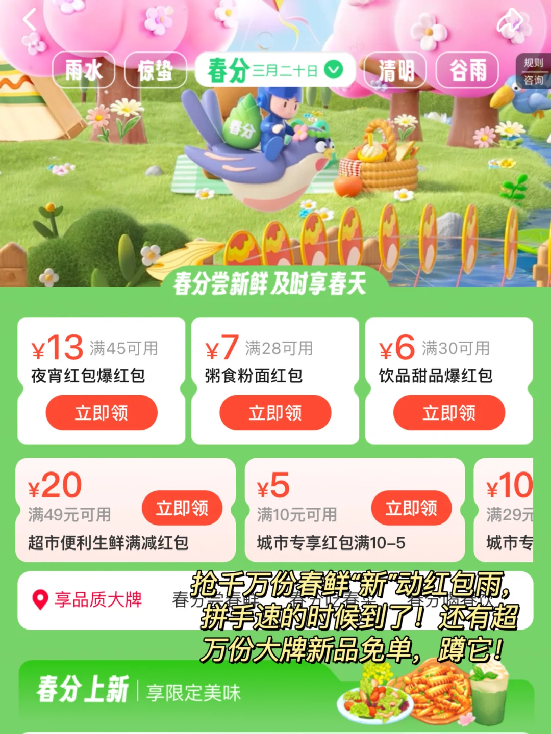 ⏰ 3月20日春分!在饿了么🔍【春新动了】,抢千万份春鲜“新”动红包雨,拼手速的时候到了!还有超万份大牌新品免单,蹲它!