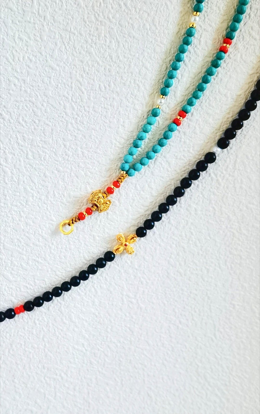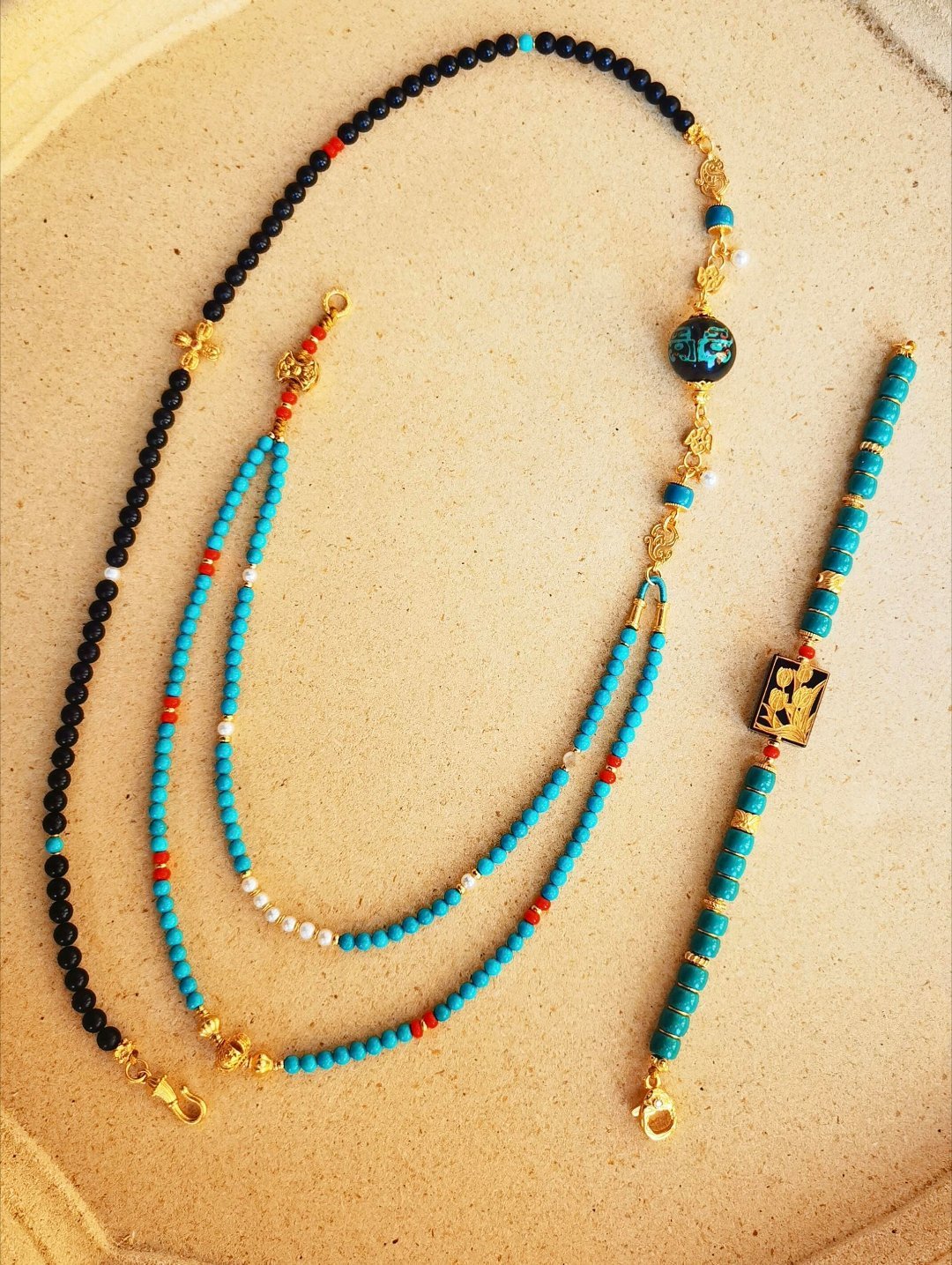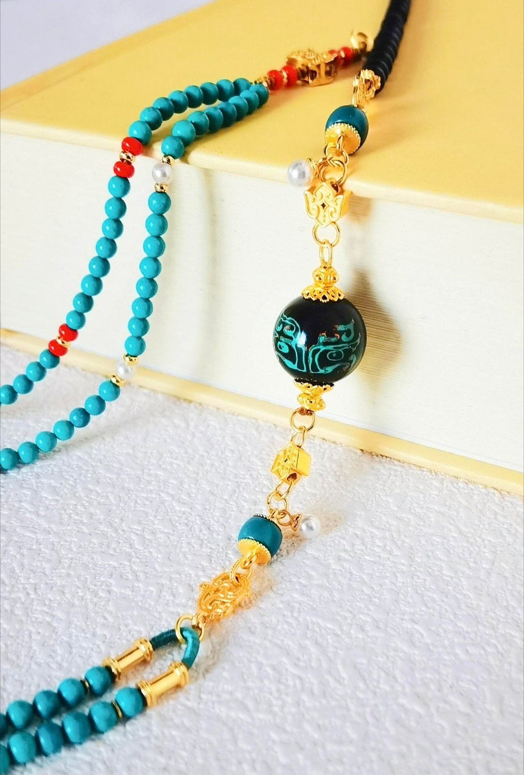 这串多圈串饰跟秋日太适配了,绿松石的清透蓝、和田玉的温润黑,混着珍珠的柔白、琉璃的亮彩,像把细碎彩虹揉进了珠子里。